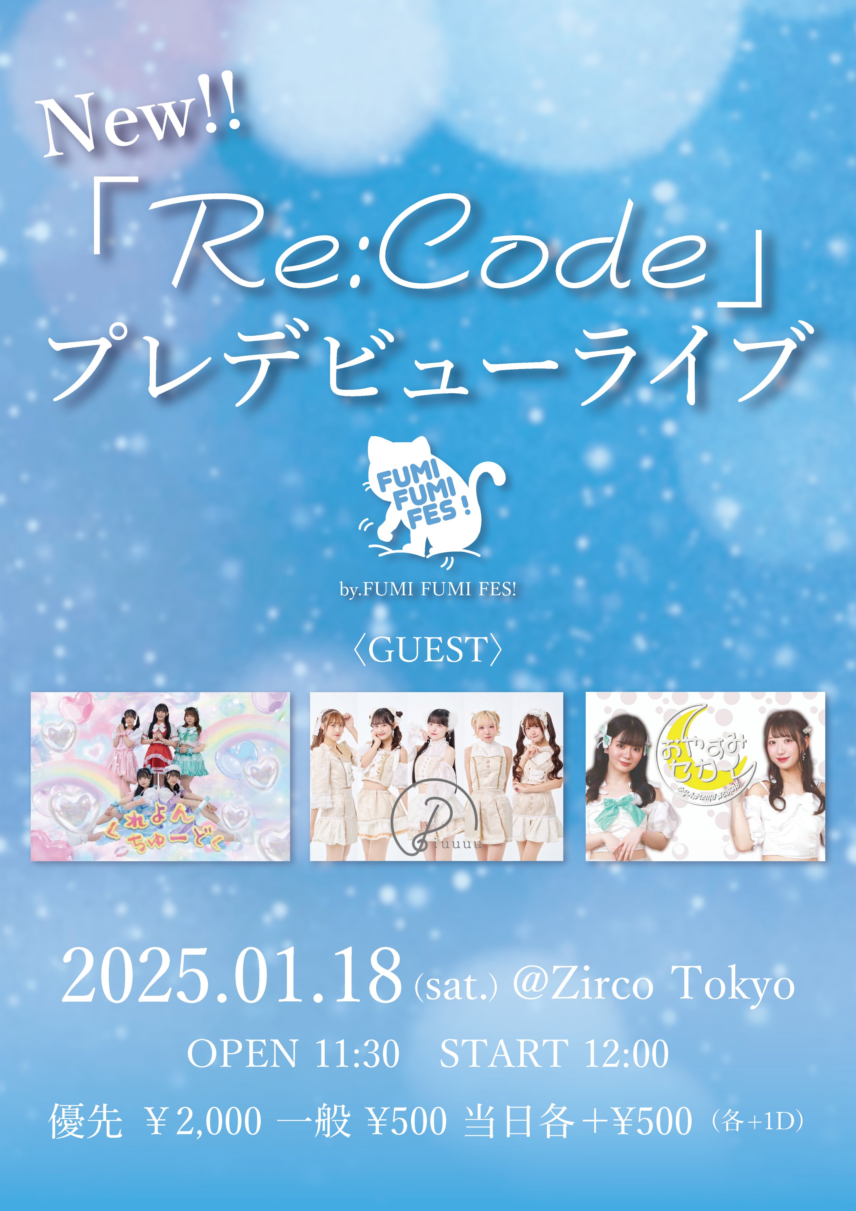 新宿歌舞伎町 Zirco Tokyo (ジルコトーキョー) スケジュール 2025.1.18(Sat) 「Re:Code」プレデビューライブ [ACT] Re:Code、Piuuuu、くれよんちゅ~どく、おやすみセカイ [OPEN/START] 11:30/12:00 [料金] 優先(S)2,000円 / 一般500円/当日各+500円(1Drink代金¥700別途必要) https://ticketdive.com/event/recode
