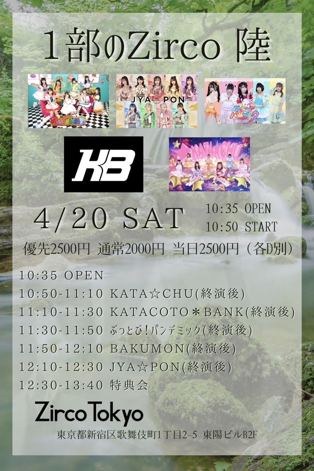 新宿歌舞伎町 Zirco Tokyo (ジルコトーキョー) スケジュール 2024.4.20(Sat) 1部のZirco 陸 [ACT] KATACOTO*BANK、ぶっとび!パンデミック、KATA⭐CHU、JYA☆PON、BAKUMON [OPEN/START] 10:35/10:50 [料金] 優先 2500円/通常 2000円/当日2500円((1Drink代金¥600別途必要) ▶入場順:①優先 ②通常 ③当日