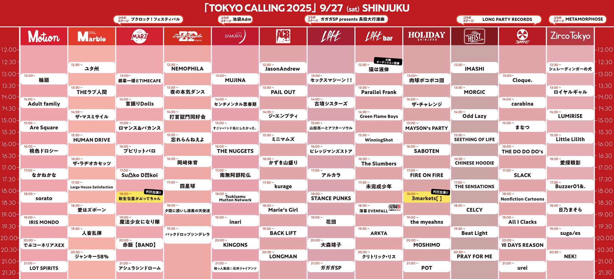 新宿歌舞伎町 Zirco Tokyo (ジルコトーキョー) スケジュール 2025.9.27(Sat) TOKYO CALLING 2025 10th Anniversary [ACT] フライヤー参照 [OPEN/START] 12:00/12:30 [料金] ADV/DOOR ¥5,800/¥6,800- (1Drink代金¥600別途必要)