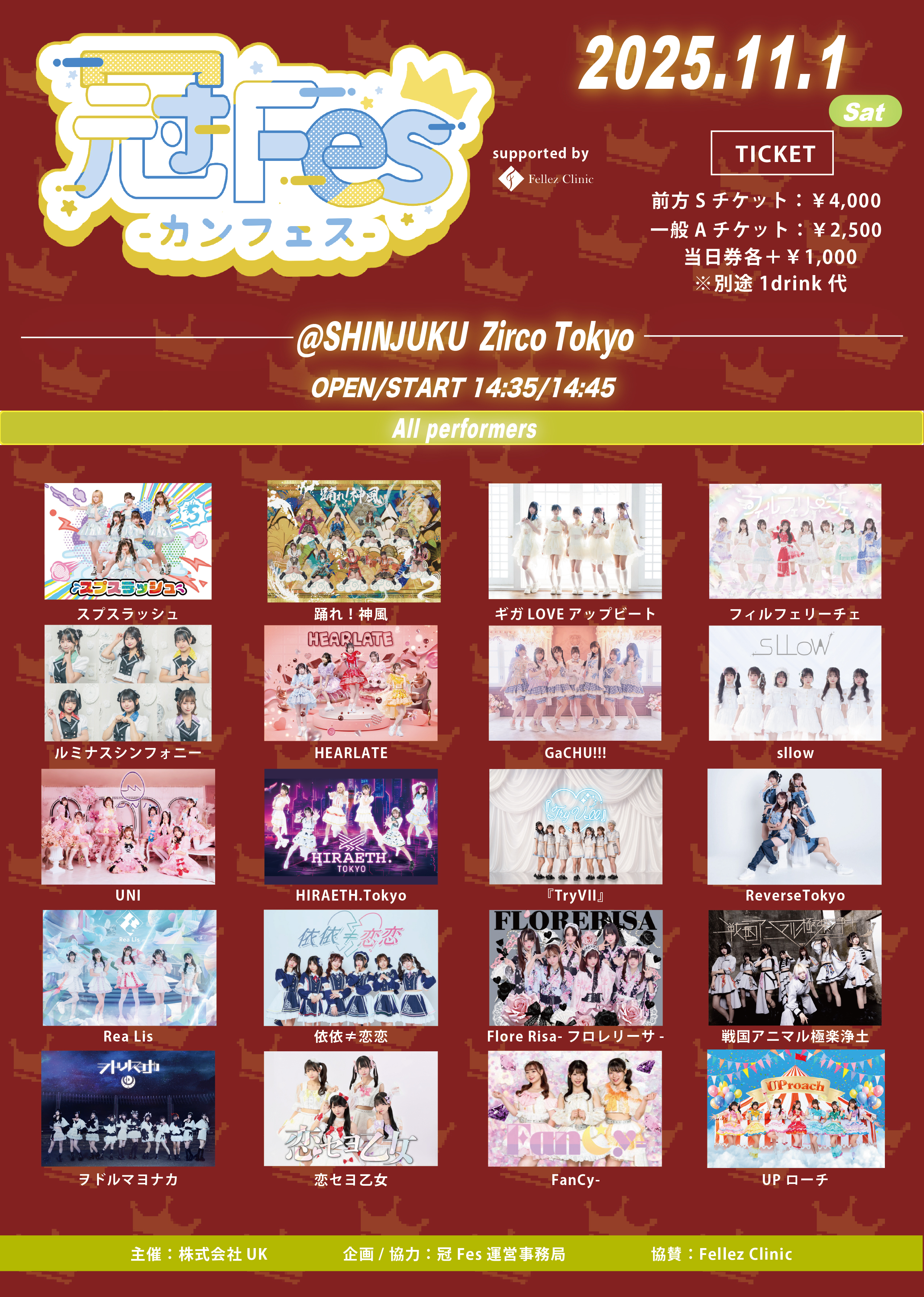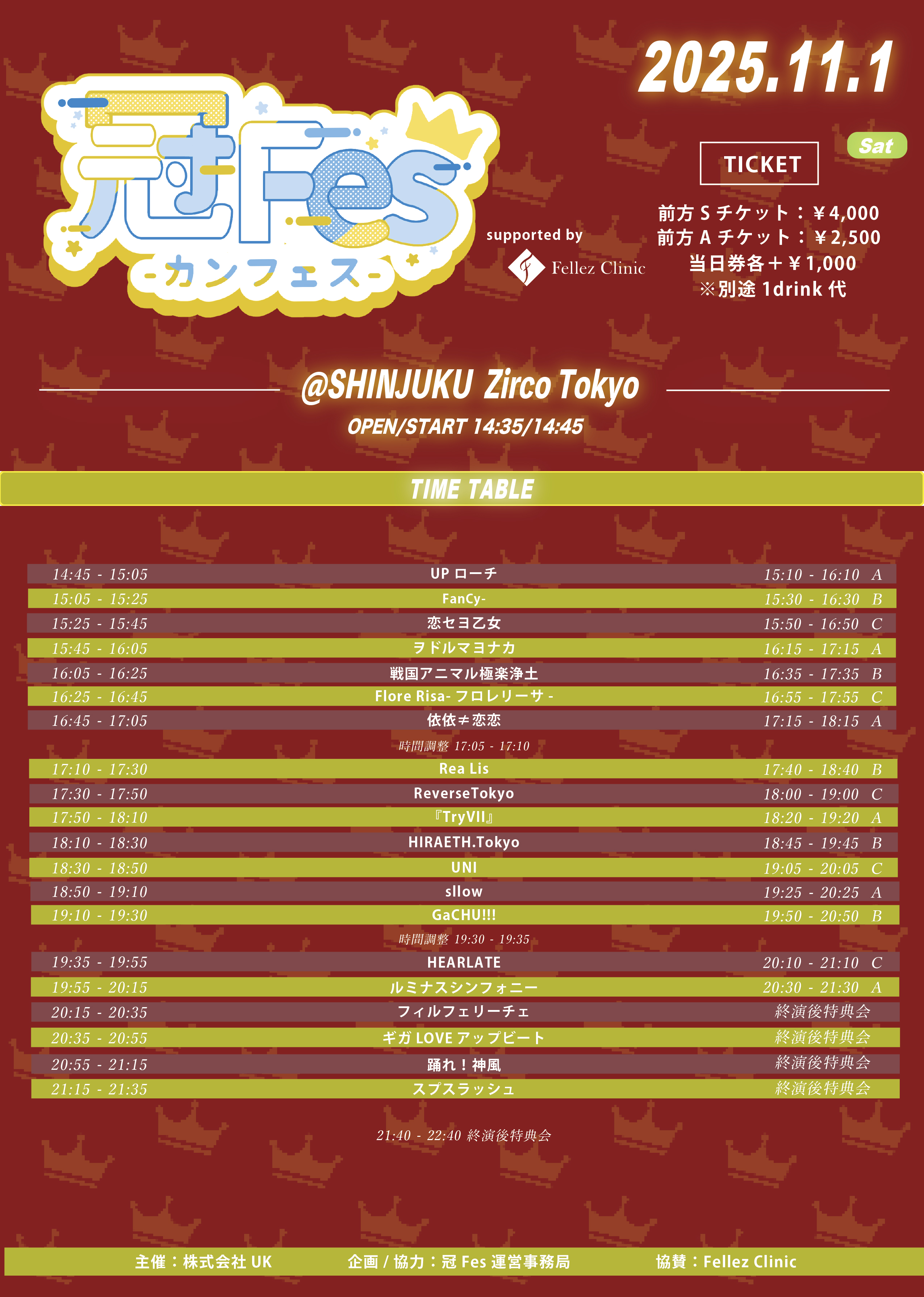 - 前方Sチケット¥4,000 / 一般Aチケット¥2,500/当日各+1,000円/ (1Drink代金¥700別途必要)