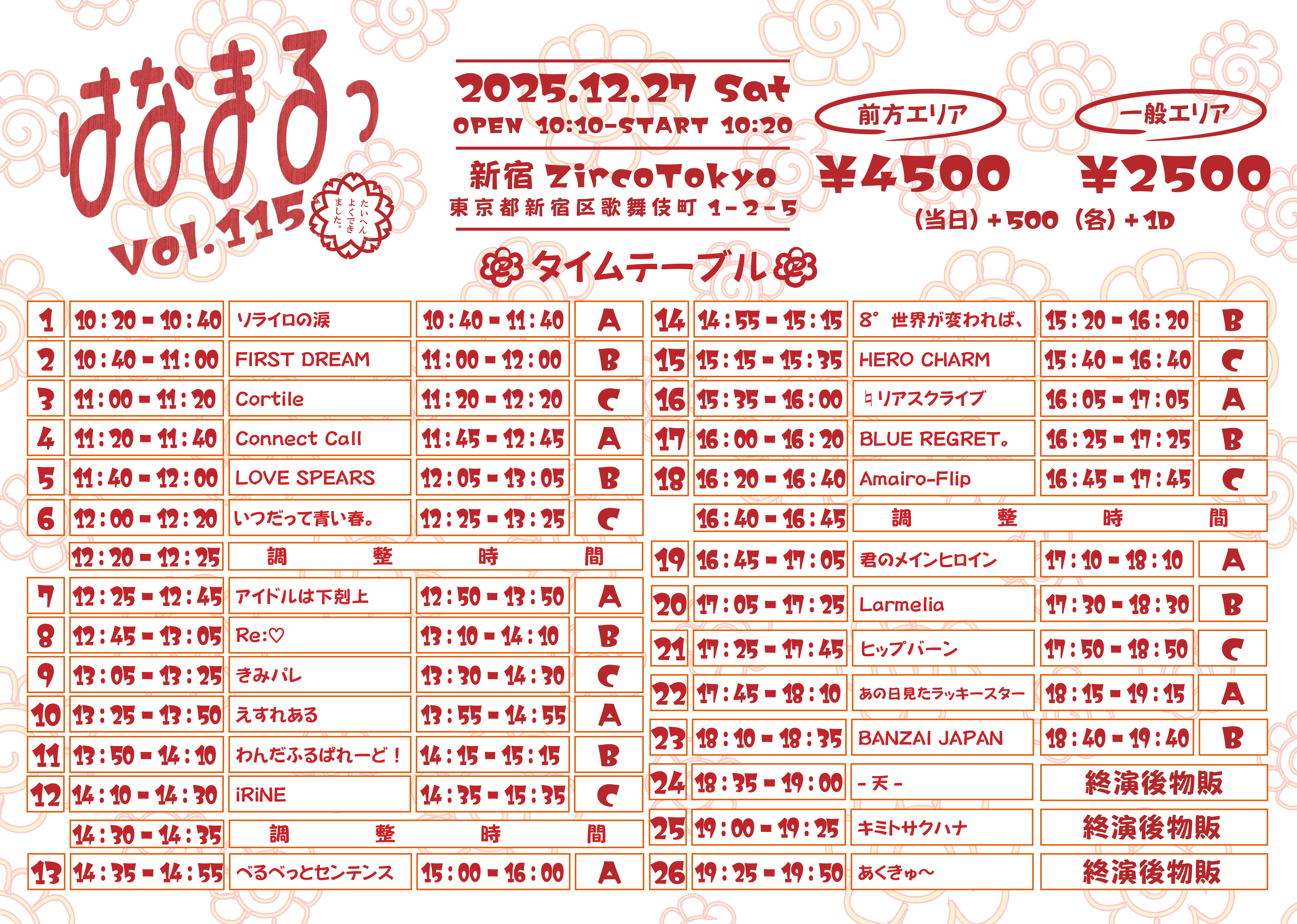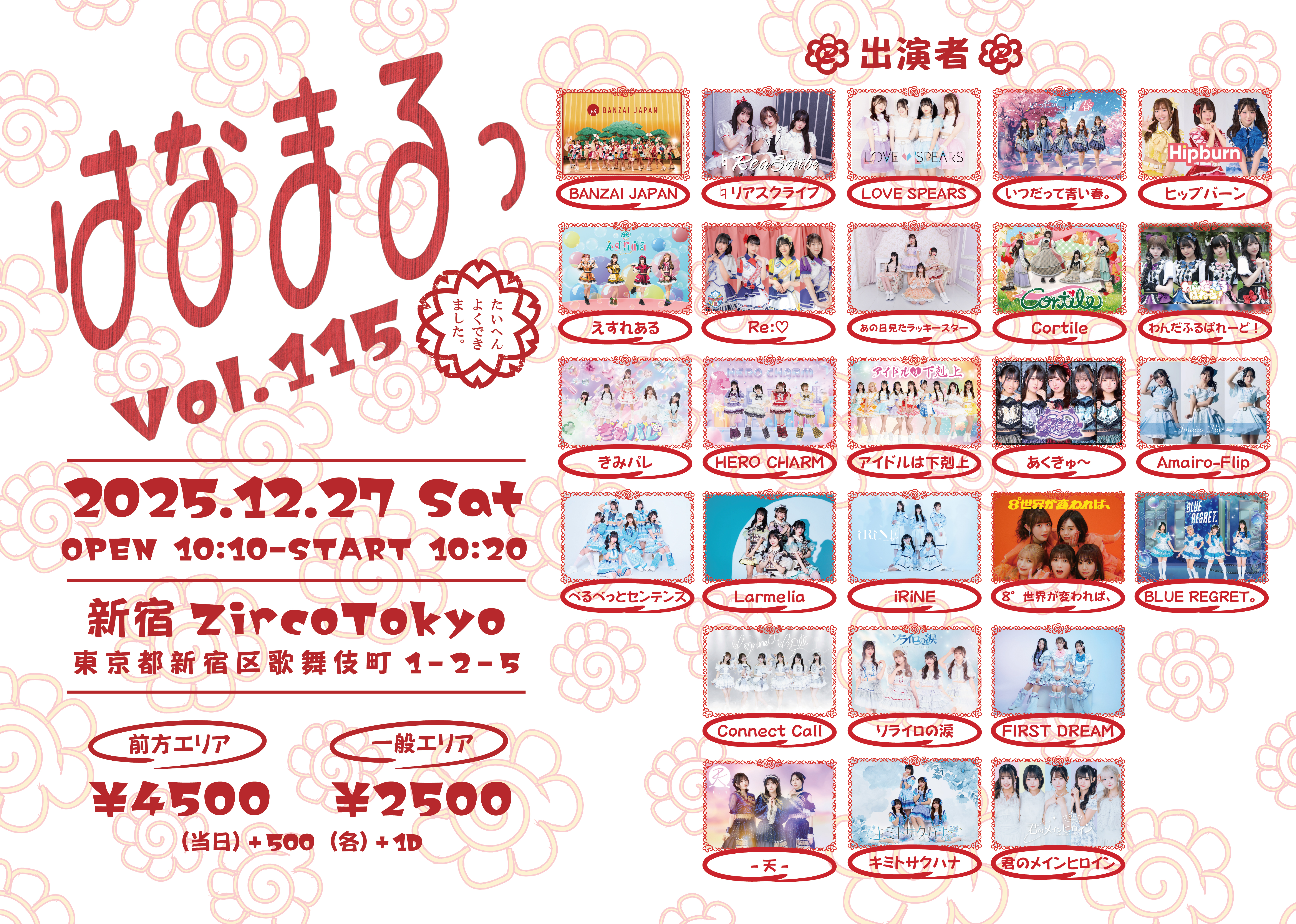 - 前方4500円 / 一般2500円 / 当日各+500円 (1Drink代金¥700別途必要)