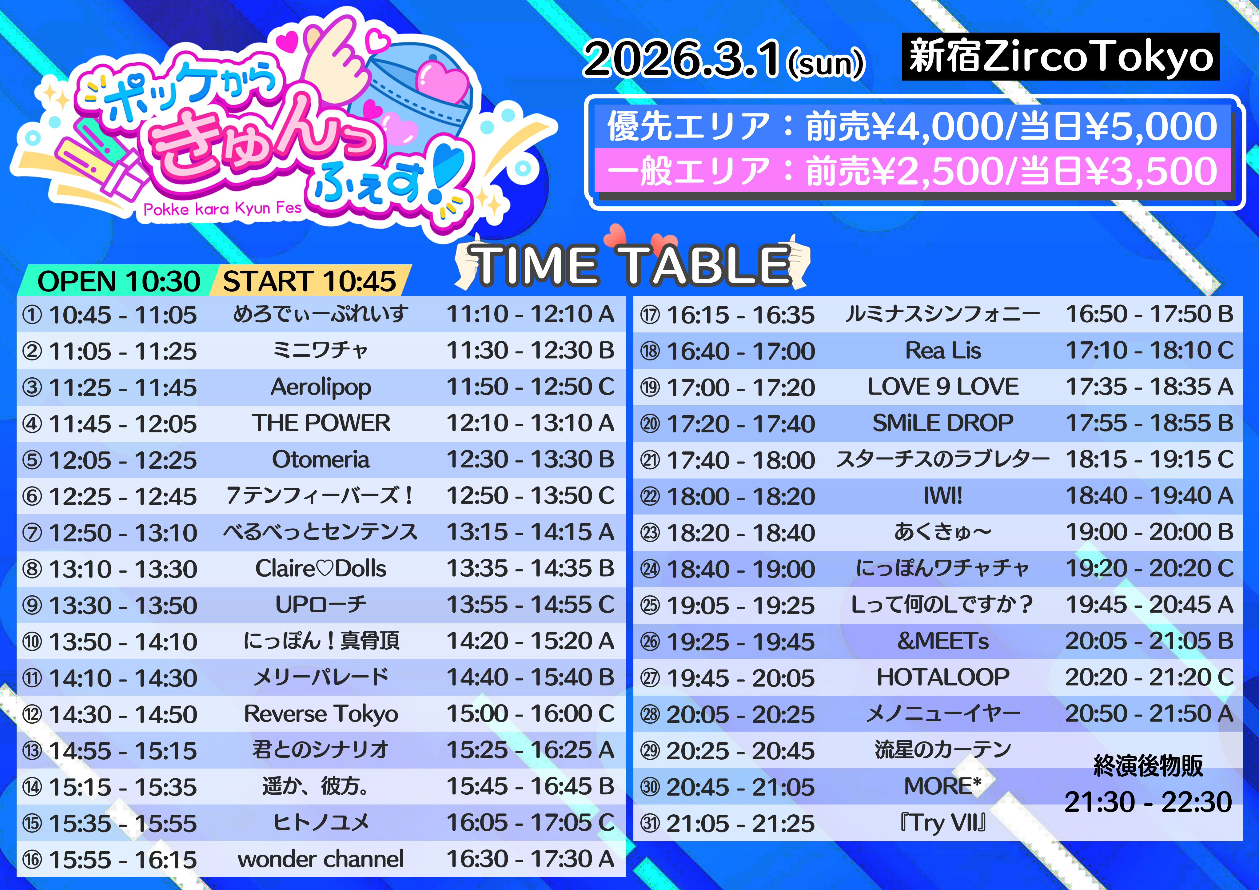 - Aerolipop/あくきゅ〜/UPローチ/&MEETs /IWI!/Lって何のLですか?/Otomeria/君とのシナリオ/Claire♡Dolls/THE POWER/スターチスのラブレター/SMiLE DROP//『Try VII』/7テンフィーバーズ!/にっぽん!真骨頂/にっぽんワチャチャ/遥か、彼方。/ヒトノユメ/べるべっとセンテンス/HOTALOOP/ミニワチャ/メノニューイヤー/メリーパレード/めろでぃーぷれいす/MORE*/LOVE 9 LOVE/Rea Lis/Reverse Tokyo/流星のカーテン/ルミナスシンフォニー/wonder channel