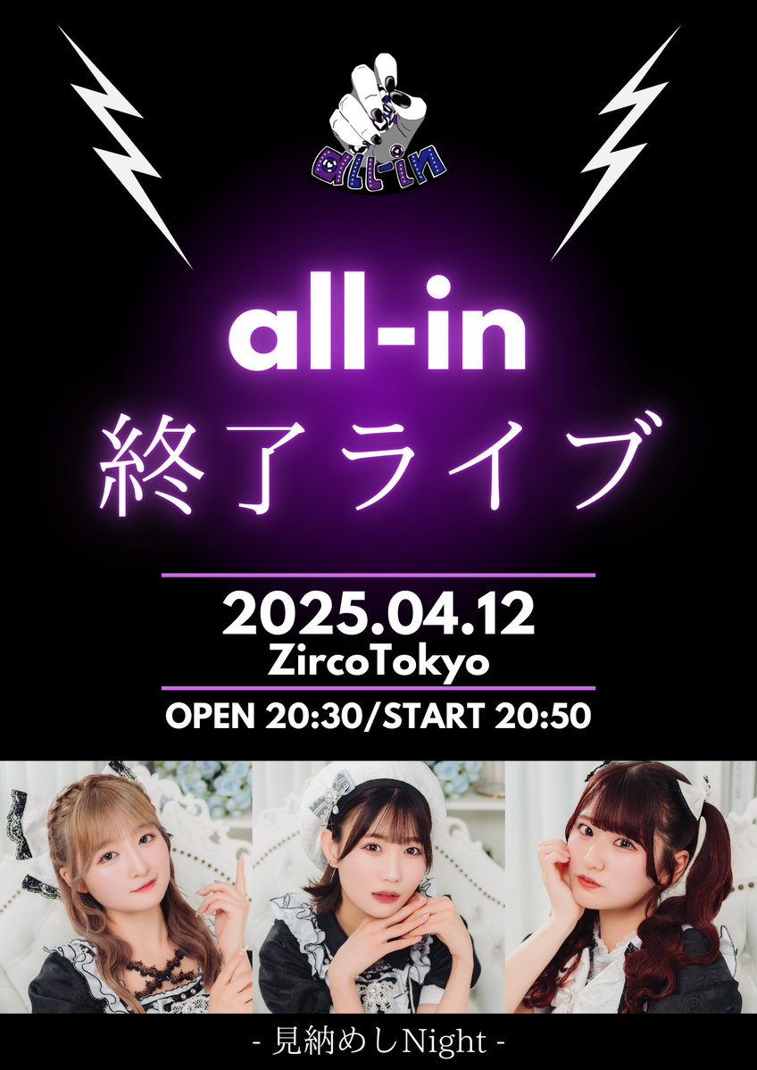 新宿歌舞伎町 Zirco Tokyo (ジルコトーキョー) スケジュール 2025.4.12(Sat) all-in終了ライブ [ACT] all-in [OPEN/START] 20:30/20:50 [料金] ADV/DOOR ¥1,500/¥2,500- (1Drink代金¥700別途必要) https://t.co/SaYkj4NM6e(問)Zirco Tokyo 03-6278-9190 / info@zirco-tokyo.jp