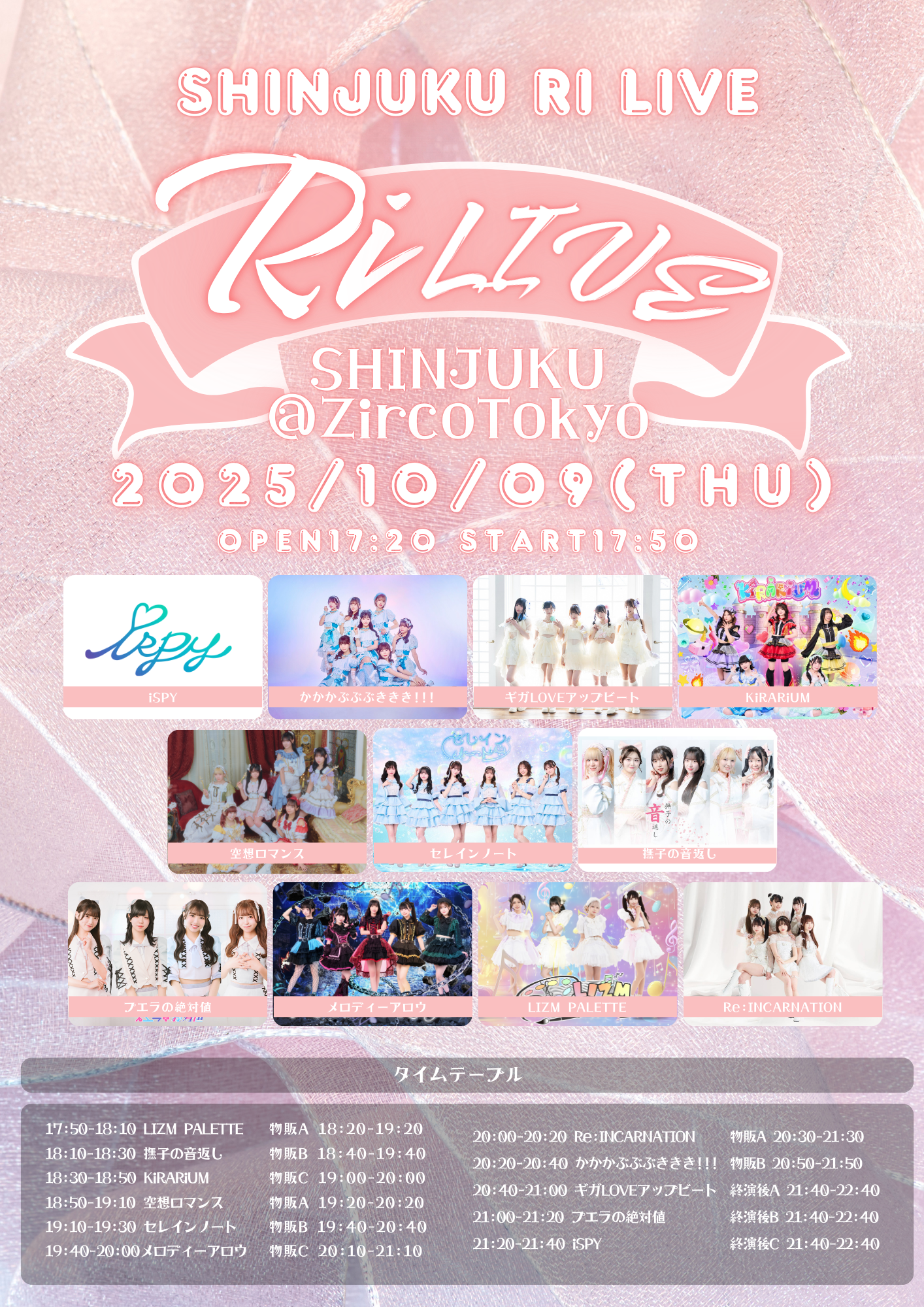 新宿歌舞伎町 Zirco Tokyo (ジルコトーキョー) スケジュール 2025.10.09(Thu) 「Shinjuku Ri LIVE」 [ACT] プエラの絶対値 / かかかぶぶぶききき!!! / iSPY / ギガLOVEアップビート / 撫子の音返し/Re:INCARNATION / メロディーアロウ / セレインノート / KiRARiUM / 空想ロマンス / LIZM PLANET [OPEN/START] 17:20/17:50 [料金] 前方 ¥3,500 / 一般 ¥2,000(各+1D)/当日券 各+¥500 (問)Zirco Tokyo 03-6278-9190 / info@zirco-tokyo.jp