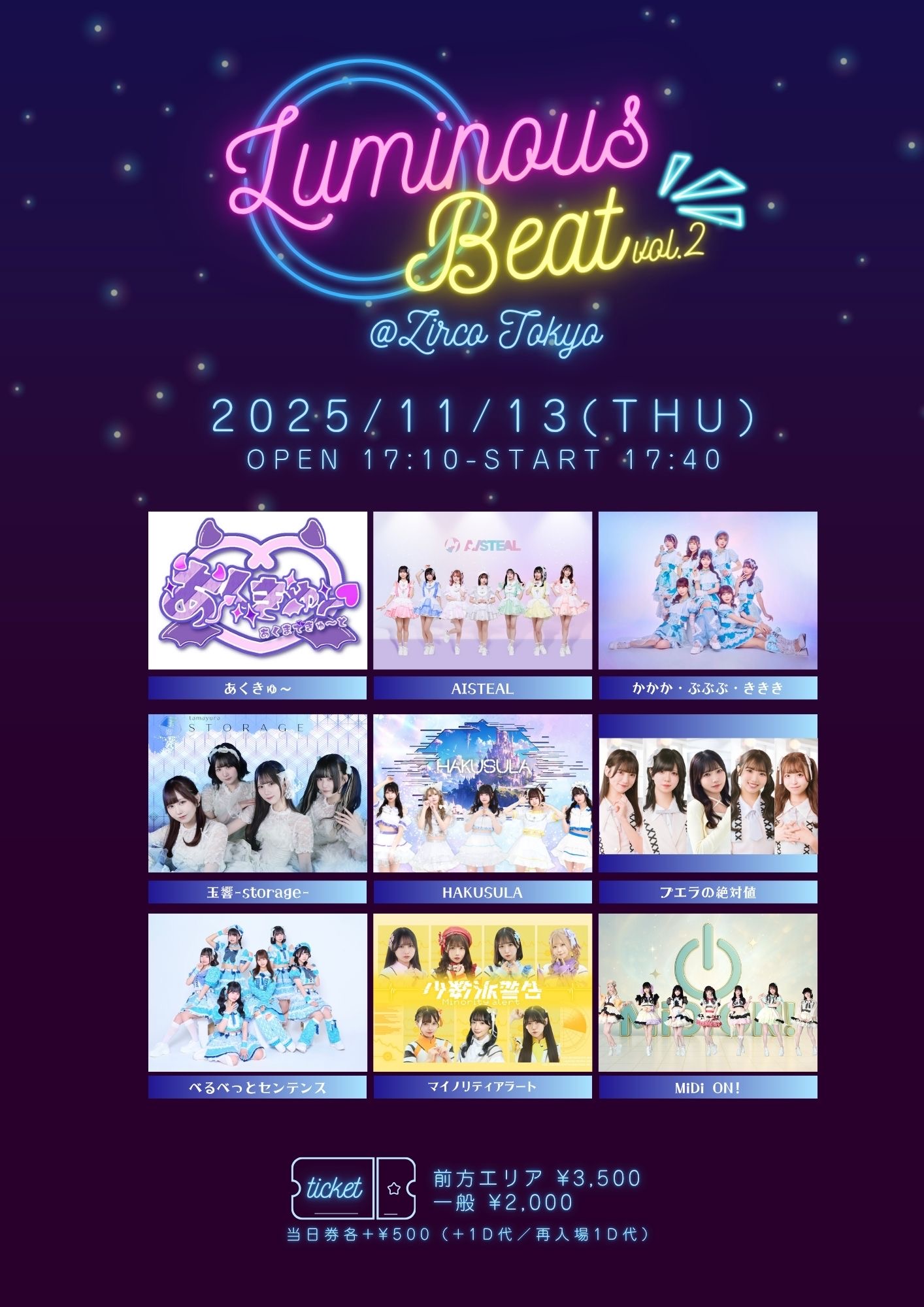 新宿歌舞伎町 Zirco Tokyo (ジルコトーキョー) スケジュール 2025.11.13(Thu) LUMINOUS BEAT [ACT] プエラの絶対値 / かかか・ぶぶぶ・ききき / 玉響-storage- / あくきゅ~ / MiDi ON! / AISTEAL / マイノリティアラート / HAKUSULA / べるべっとセンテンス [OPEN/START] 17:30/18:00 [料金] 前方チケット¥3,5000/一般チケット¥2,000- (1Drink代金¥700別途必要) (問)Zirco Tokyo 03-6278-9190 / info@zirco-tokyo.jp