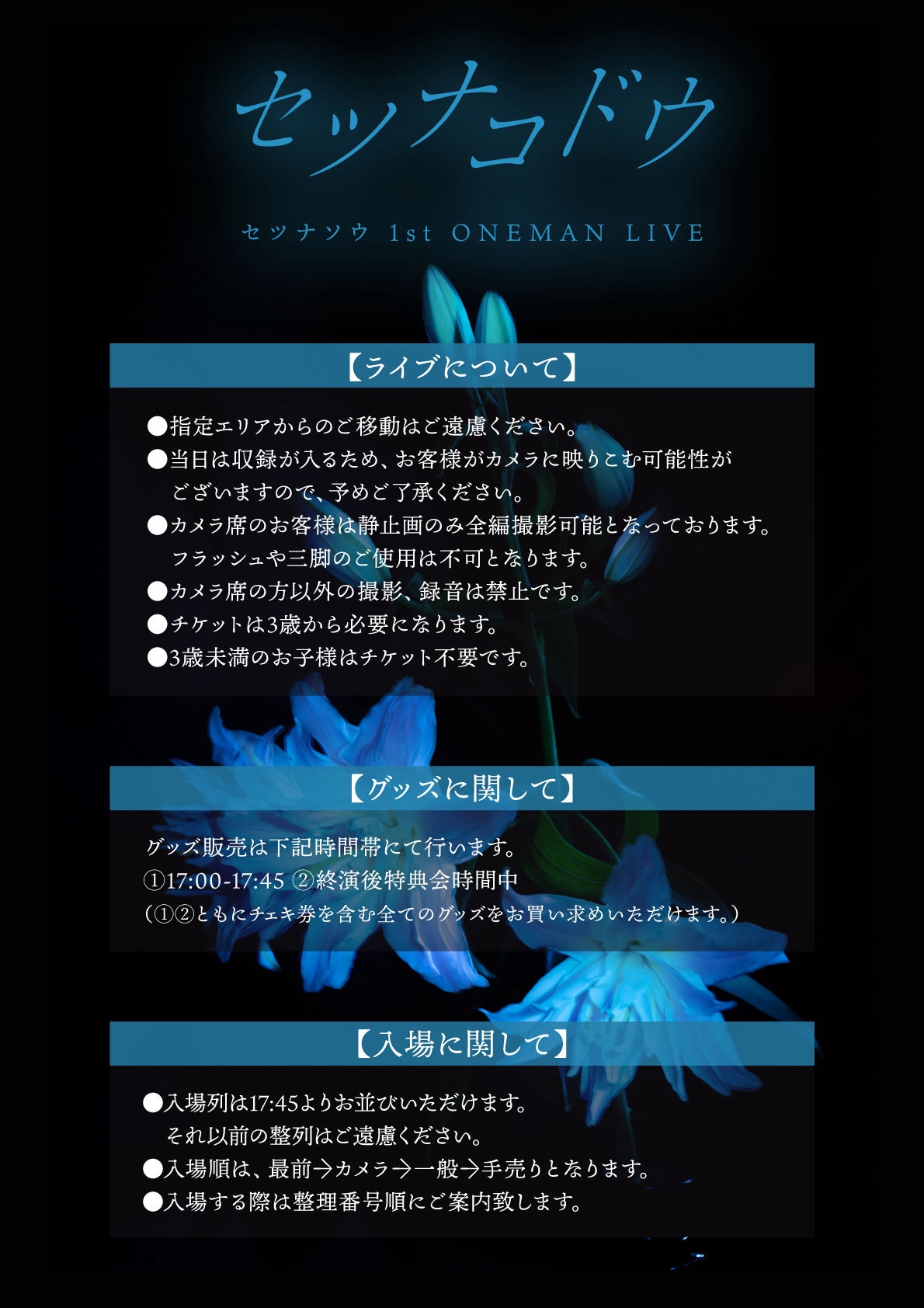 新宿歌舞伎町 Zirco Tokyo (ジルコトーキョー) スケジュール 2025.10.20(Mon) セツナソウ 1st ONEMAN LIVE 「 セツナコドウ 」 [ACT] 相楽栞里 / 苑田笑奈 / 音羽ひより / 結季れおな / 渋谷とあ / 綾咲凛音 / セツナソウ / ハイシーユース [OPEN/START] 18:00/18:30 [料金] 最前チケット ¥6500(セツナソウオリジナルTシャツ付き) カメラチケット ¥5000 一般チケット ¥3000 手売チケット ¥500(1Drink代金¥700別途必要) (問)Zirco Tokyo 03-6278-9190 / info@zirco-tokyo.jp