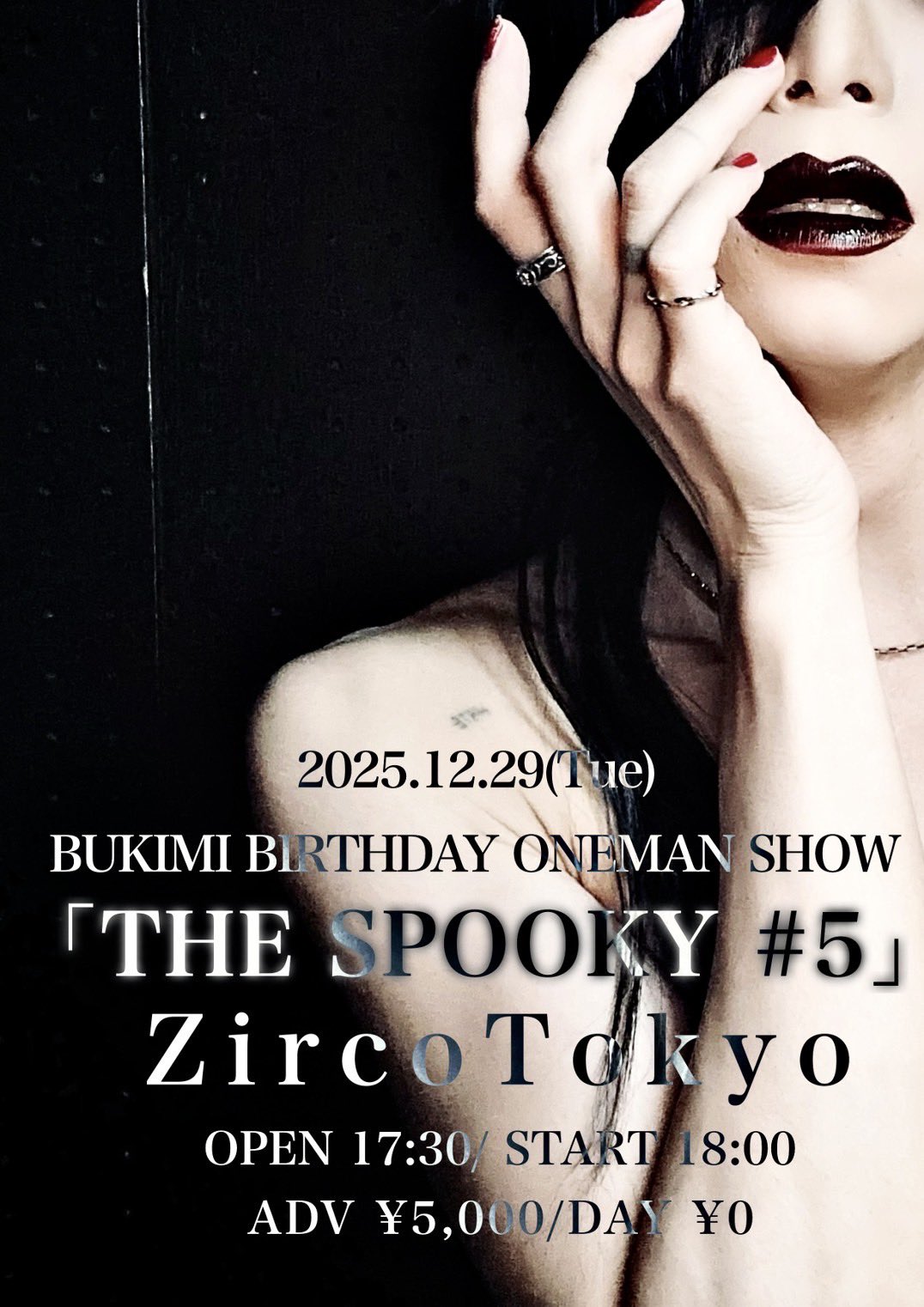 新宿歌舞伎町 Zirco Tokyo (ジルコトーキョー) スケジュール 2025.12.29(Mon) BUKIMI BIRTHDAY ONEMAN SHOW 「THE SPOOKY #5」 [ACT] ジグソウ [OPEN/START] 17:30/18:00 [料金] ADV/DOOR ¥5,000/¥0- (1Drink代金¥700別途必要)