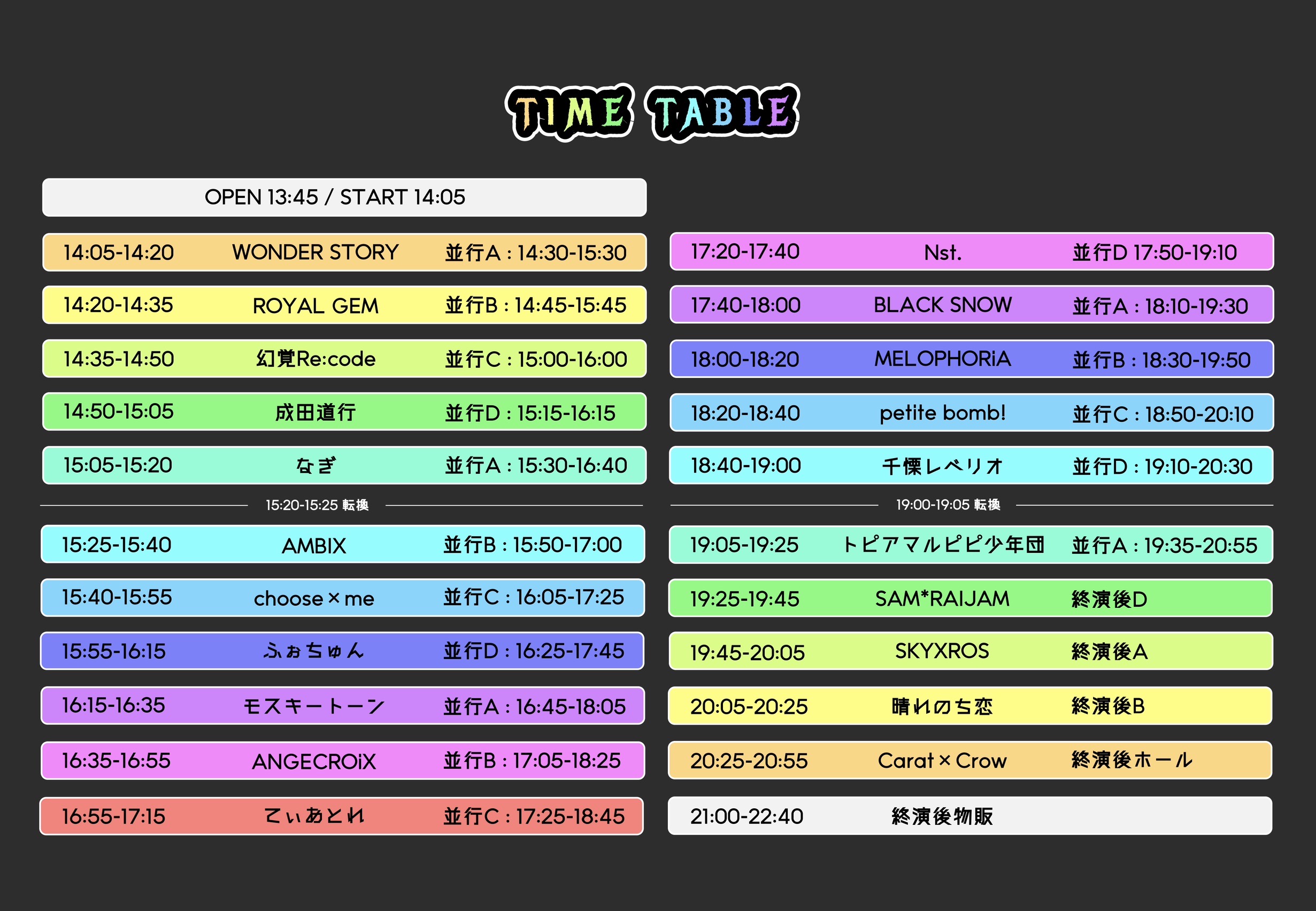 - Carat×Crow/WONDER STORY/ROYAL GEM/幻覚Re:code/成田道行/なぎ/AMBIX/choose×me/ふちゅん/モスキートーン/ANGECROiX/てぃあとれ/Nst./BLACK SNOW/MELOPHOARiA/petite bomb!/千慄レベリオ/トピアマルピピ少年団/SAM*RAIJAM/SKYXROS/晴れのち恋