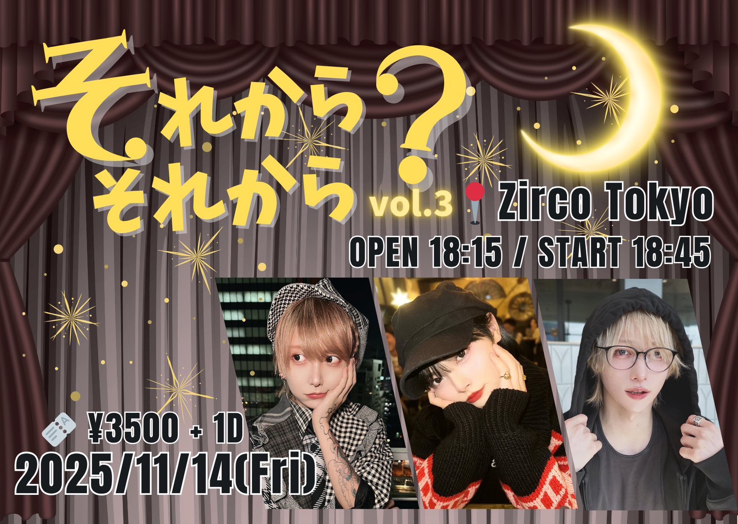 新宿歌舞伎町 Zirco Tokyo (ジルコトーキョー) スケジュール 2025.11.14(Fri) それからそれから vol.3 [ACT] いりぽん , ゆじまる , 黒宮ノア [OPEN/START] 18:15:18:45 [料金] ADV¥3,500 (1Drink代金¥700別途必要) (問)Zirco Tokyo 03-6278-9190 / info@zirco-tokyo.jp