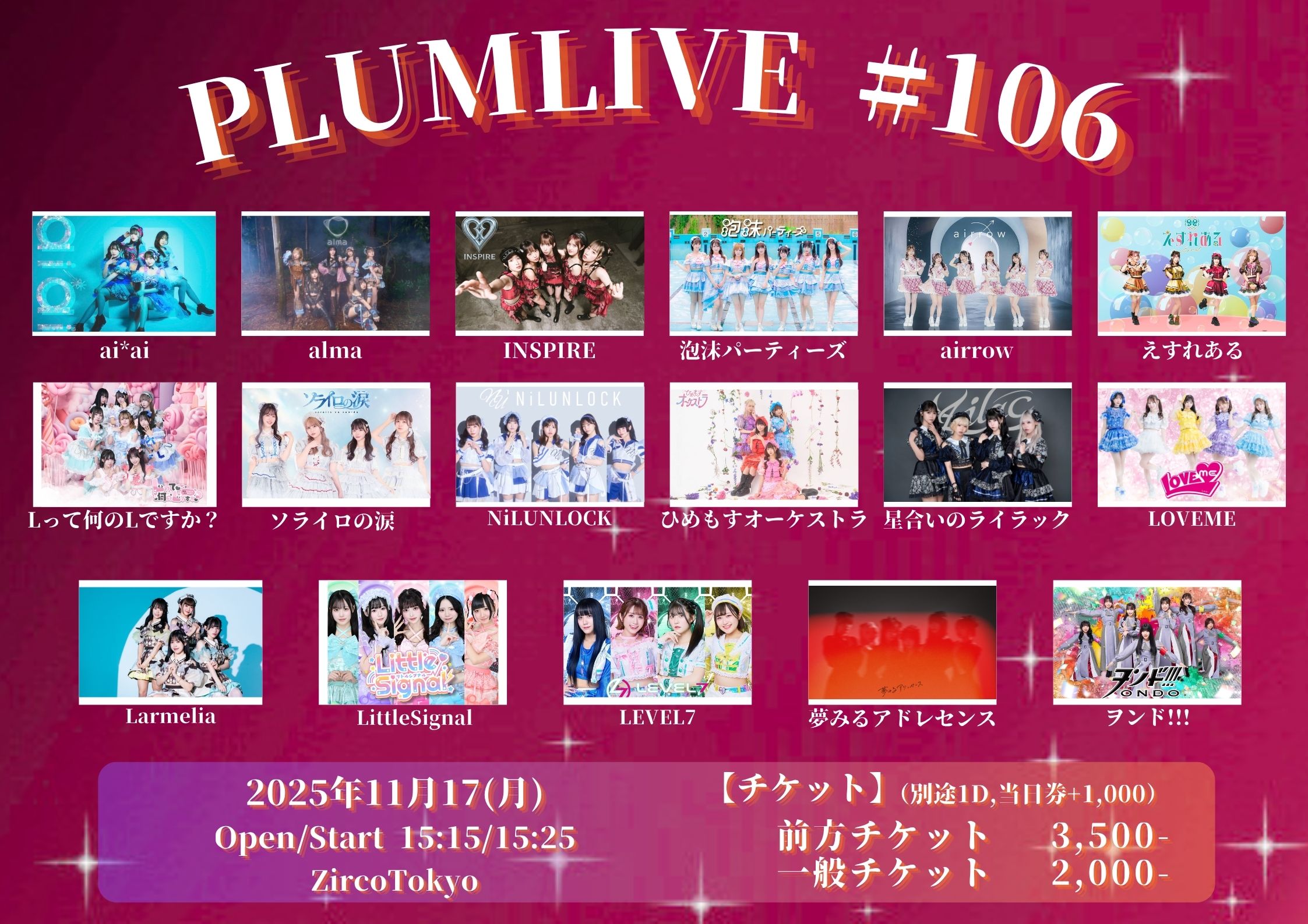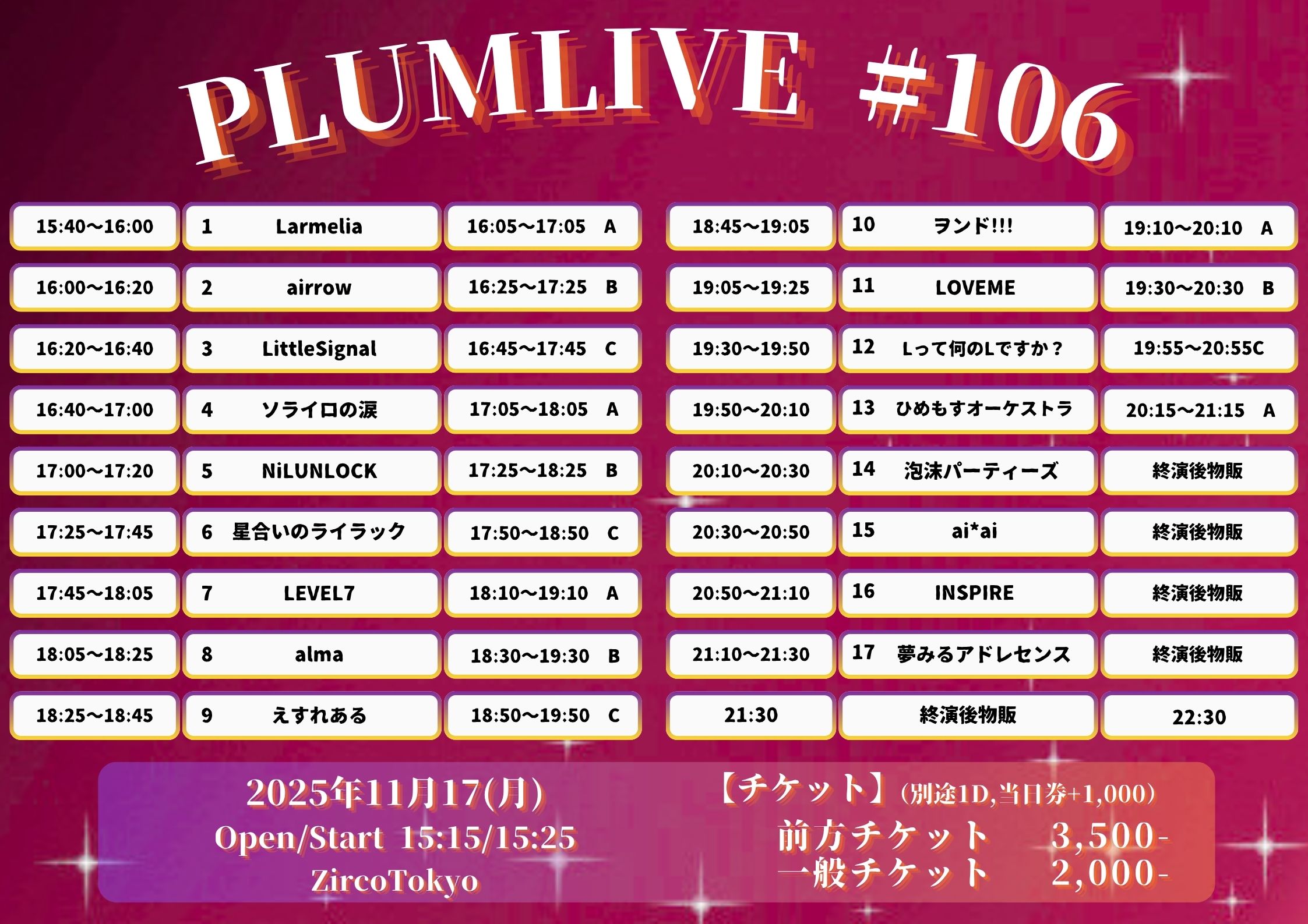 新宿歌舞伎町 Zirco Tokyo (ジルコトーキョー) スケジュール 2025.11.17(Mon) PLUMLIVE #106 [ACT] 泡沫パーティーズ/LOVEME/alma/NiLUNLOCK/airrow/夢みるアドレセンス/INSPIRE/ヲンド!!!/ひめもすオーケストラ/ソライロの涙/ai*ai/LEVEL7/Lって何のLですか?/LittleSignal/Larmelia/星合いのライラック/えすれある/ [OPEN/START] 15:15/15:25 [料金] 前方チケット¥3,500/一般チケット¥2,000/当日券各+¥1,000(1Drink代金¥700別途必要) (問)Zirco Tokyo 03-6278-9190 / info@zirco-tokyo.jp