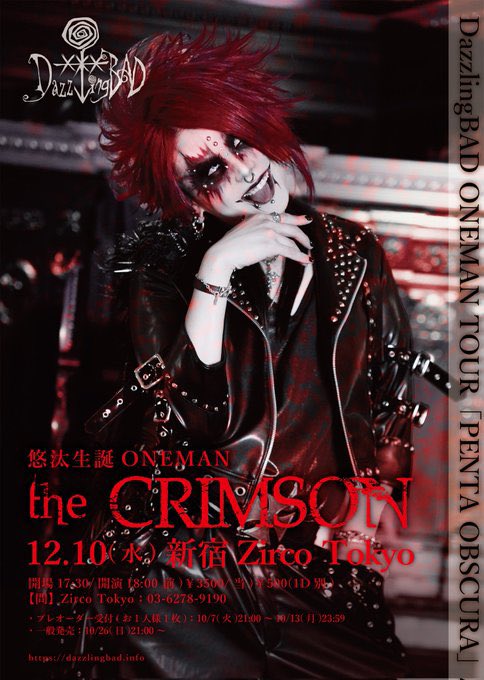 新宿歌舞伎町 Zirco Tokyo (ジルコトーキョー) スケジュール 2025.12.10(Wed) DazzlingBAD 悠汰生誕ONEMAN 「the CRIMSON」 [ACT] DazzlingBAD [OPEN/START] 17:30/18:00 [料金] ADV/DOOR ¥3,500/¥500- (1Drink代金¥700別途必要)