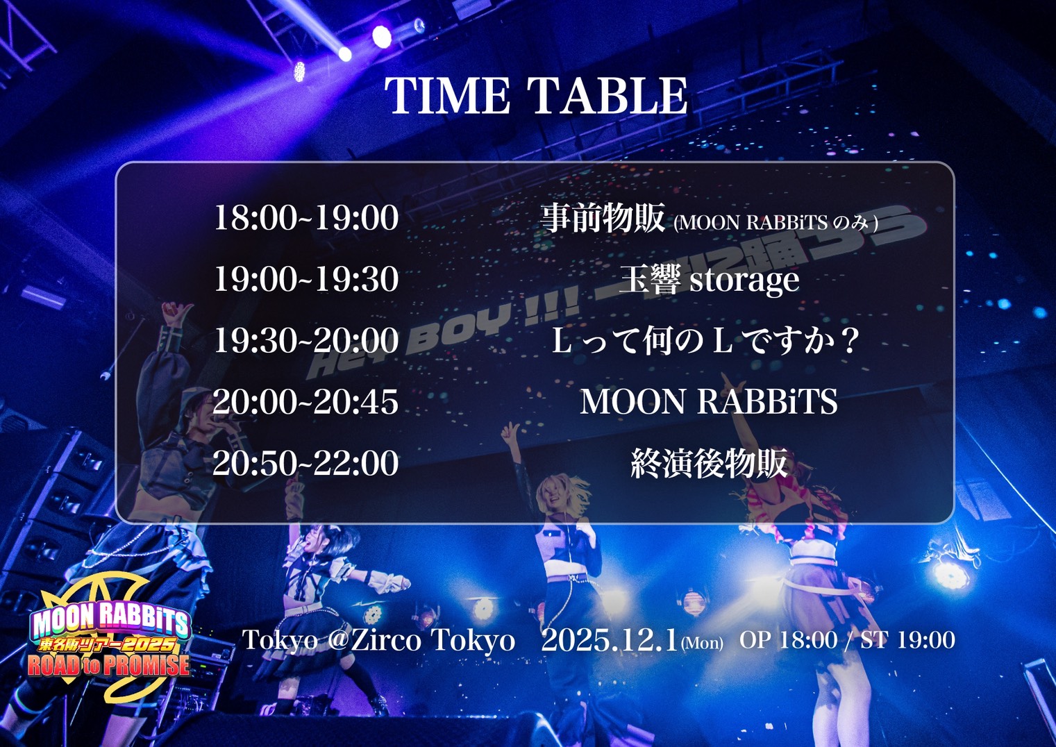 新宿歌舞伎町 Zirco Tokyo (ジルコトーキョー) スケジュール 2025.12.01(Mon) MOON RABBiTS 東名阪ツアー2025 ROAD to PROMiSE in 東京 [ACT] MOON RABBiTS , Lって何のLですか? , 玉響storage [OPEN/START] 18:00/19:00 [料金] 前方チケット ¥3,000 /一般チケット ¥500/当日券:各チケット代+¥500(1Drink代金¥700別途必要) (問)Zirco Tokyo 03-6278-9190 / info@zirco-tokyo.jp