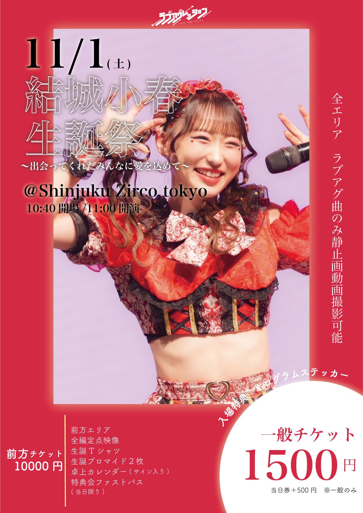 新宿歌舞伎町 Zirco Tokyo (ジルコトーキョー) スケジュール 2025.11.01(Sat) 結城小春生誕祭2025〜出会ってくれたみんなに愛を込めて〜 [ACT] ラブアグレッション [OPEN/START] 10:40/11:00 [料金] 前方10000円/一般1500円 ※当日は一般チケットのみ(+500円) ※各チケット別途+1D (問)Zirco Tokyo 03-6278-9190 / info@zirco-tokyo.jp