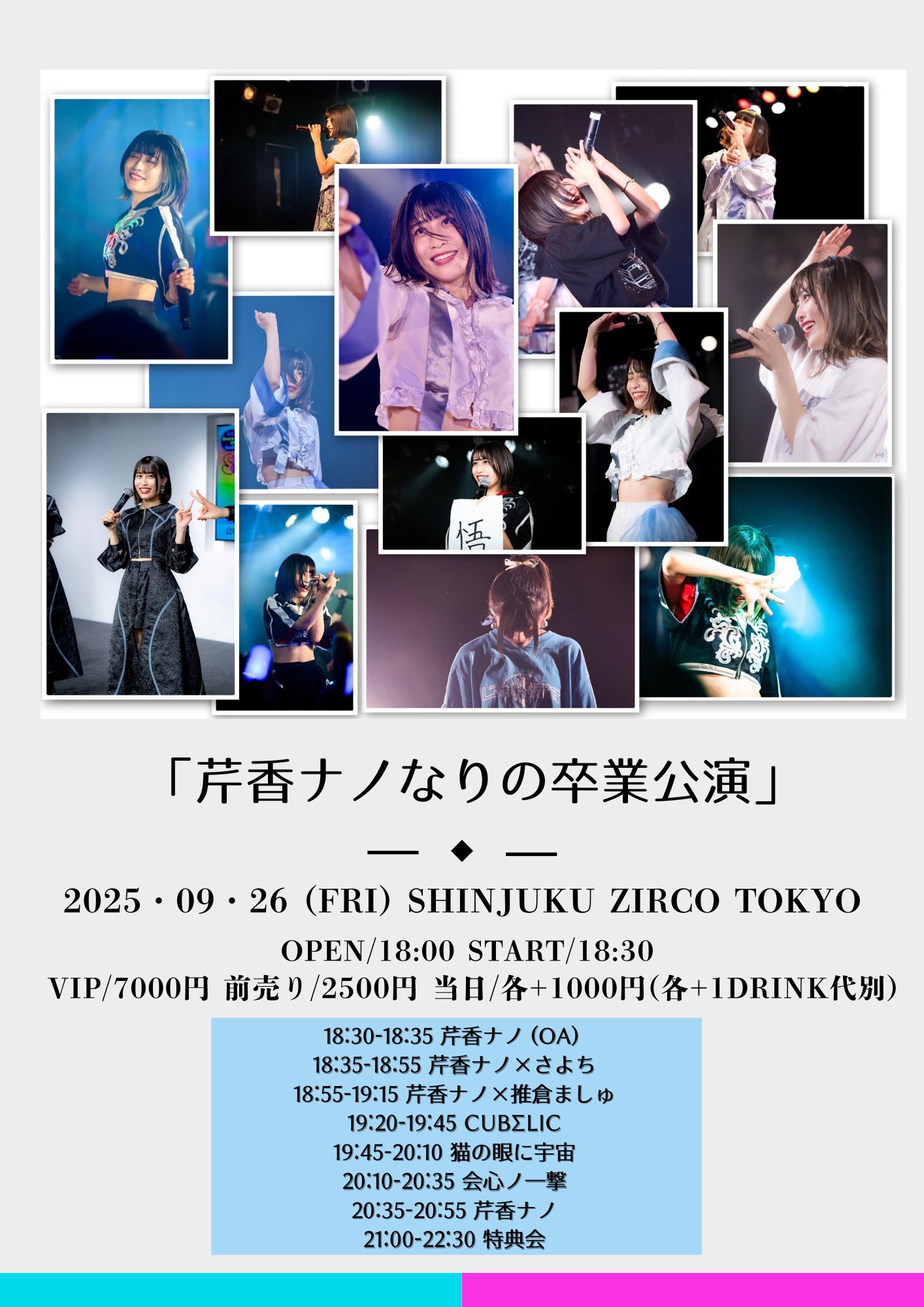 新宿歌舞伎町 Zirco Tokyo (ジルコトーキョー) スケジュール 2025.9.26(Fri) 「芹香ナノなりの卒業公演」 [ACT] 芹香ナノ猫の眼に宇宙/会心ノ一撃 /CUBΣLIC /SPゲストあり [OPEN/START] 18:00/18:30 [料金] VIP¥7000 / 前売り¥2500 (1Drink代金¥700別途必要) (問)Zirco Tokyo 03-6278-9190 / info@zirco-tokyo.jp