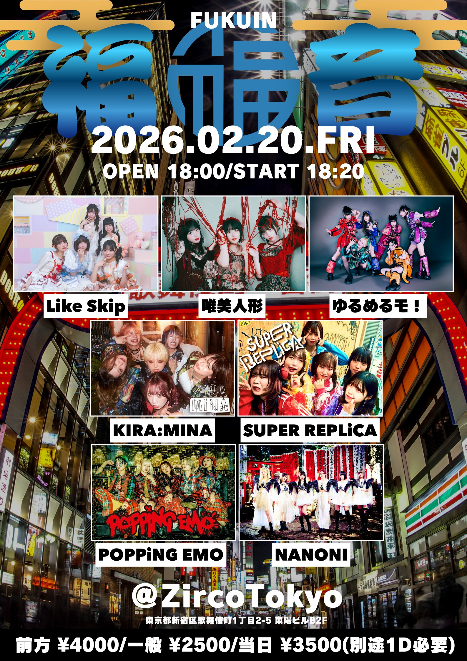 新宿歌舞伎町 Zirco Tokyo (ジルコトーキョー) スケジュール 2026.2.20(Fri) FUKUIN−福音– [ACT] POPPiNG EMO / SUPER REPLiCA / KIRA:MINA / NANONI / ゆるめるも! / 唯美人形 / Like Skip [OPEN/START] 18:00/18:20 [料金] 前方 ¥4000 一般 ¥2500 当日 ¥3500(1Drink代金¥700別途必要) https://t-dv.com/FUKUIN20260220 番号順での入場(前方▶︎一般▶︎当日)