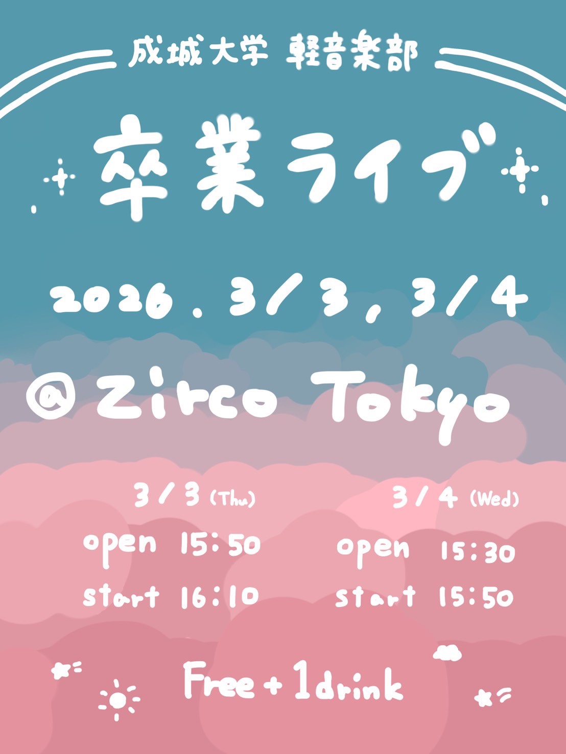 新宿歌舞伎町 Zirco Tokyo (ジルコトーキョー) スケジュール 2026.3.03(Tue) 成城大学軽音学部 卒業ライブ [ACT] 成城大学軽音学部 [OPEN/START] 15:50/16:10 [料金] ADV/DOOR ¥0/¥0 (1Drink代金¥700別途必要) (問)Zirco Tokyo 03-6278-9190 / info@zirco-tokyo.jp