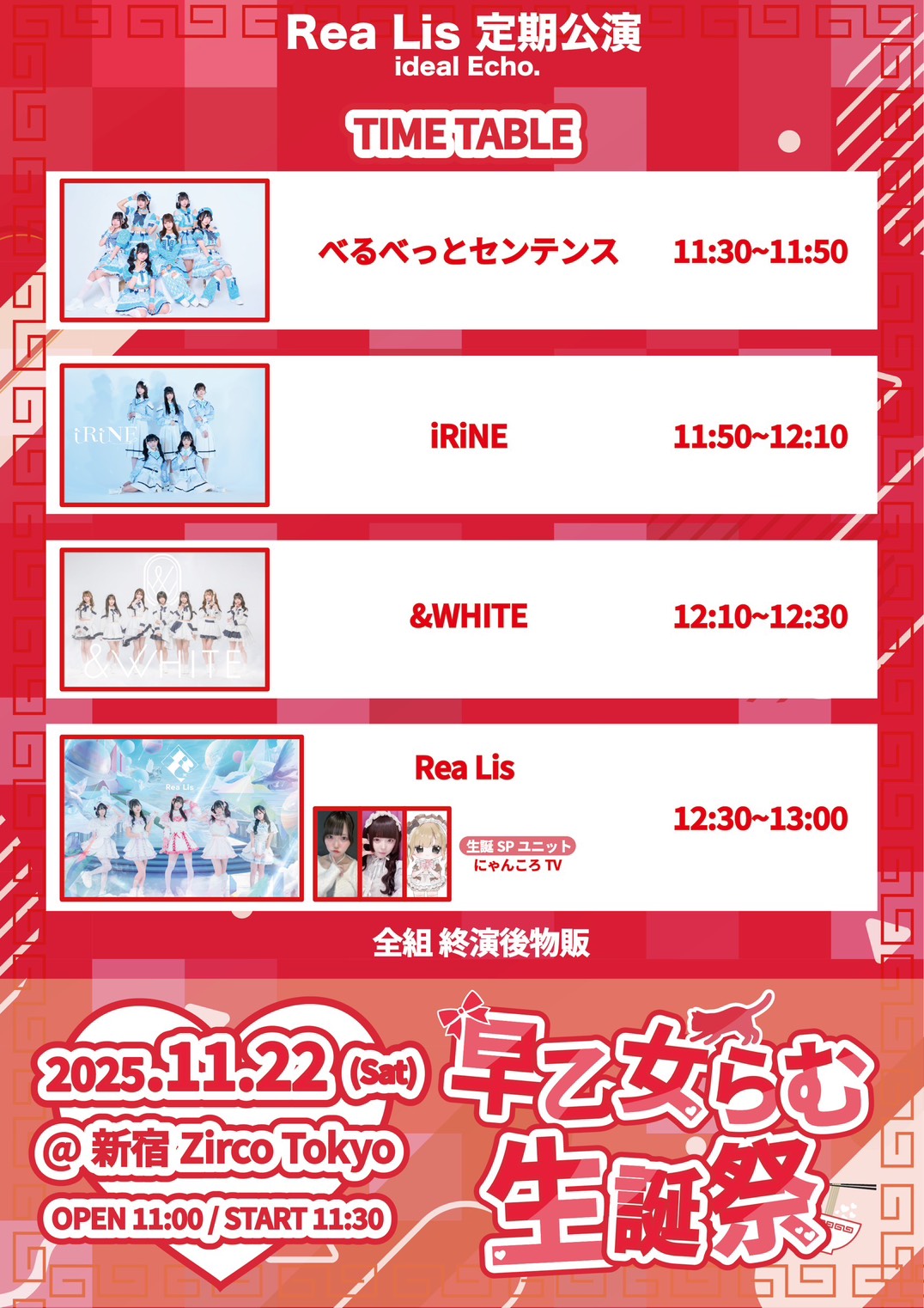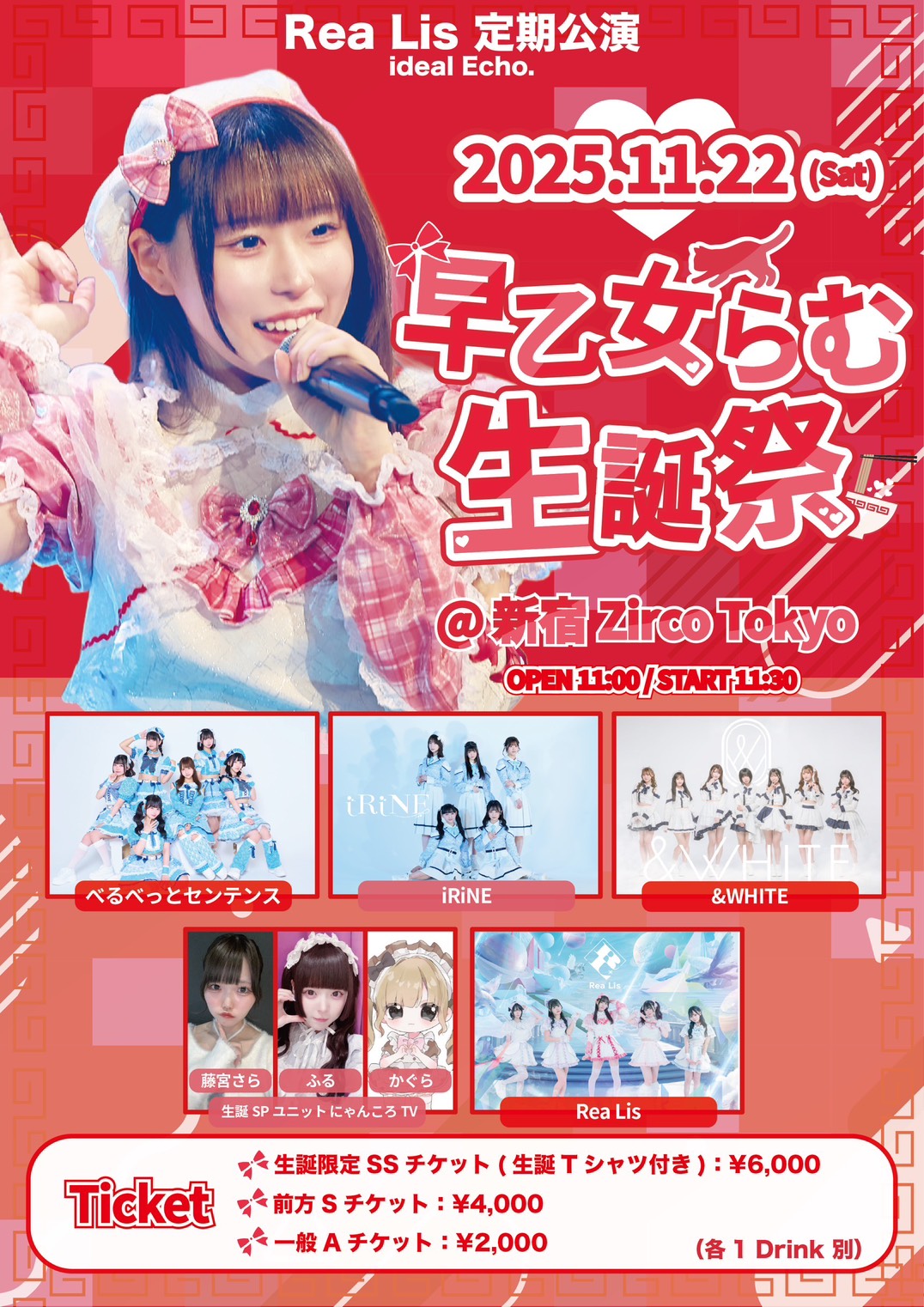 新宿歌舞伎町 Zirco Tokyo (ジルコトーキョー) スケジュール 2025.11.22(Sat) Rea Lis 定期公演『ideal Echo.〜早乙女らむ生誕祭〜』 [ACT] Rea Lis/べるべっとセンテンス/iRiNE/&WHITE [OPEN/START] 11:00/11:30 [料金] (前売り)生誕限定SSチケット:¥6,000 / (当日)販売なし/(前売り)前方Sチケット:¥4,000 / (当日)前方Sチケット:¥5,000/(前売り)一般Aチケット:¥2,000 / (当日)一般Aチケット:¥3,000(1Drink代金¥700別途必要) (問)Zirco Tokyo 03-6278-9190 / info@zirco-tokyo.jp