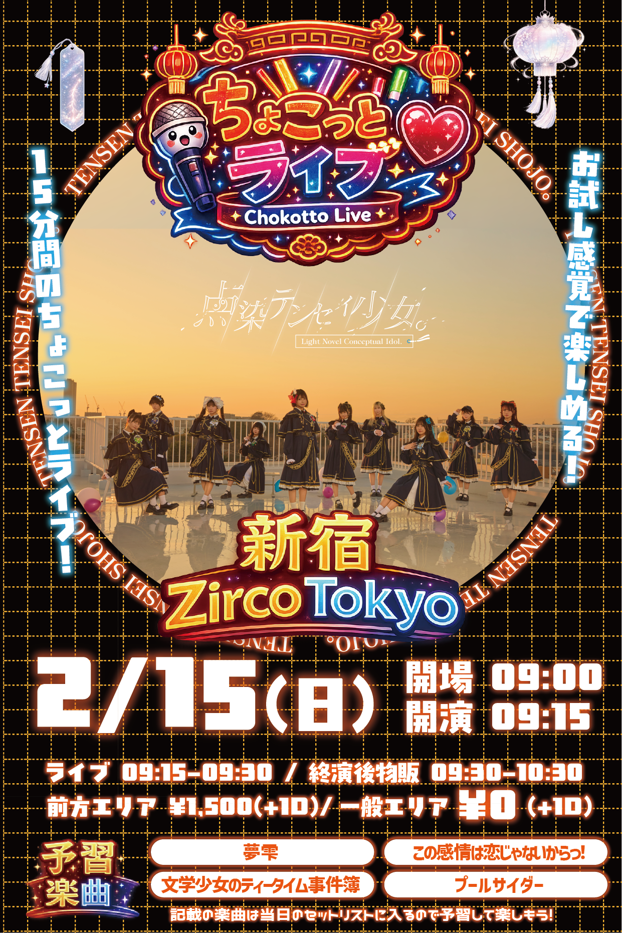 新宿歌舞伎町 Zirco Tokyo (ジルコトーキョー) スケジュール 2026.2.15(Sun) ちょこっとライブ [ACT] 点染テンセイ少女。 [OPEN/START] 9:00/9:15 [料金] 前方¥1,500/一般¥0- (1Drink代金¥700別途必要) (問)Zirco Tokyo 03-6278-9190 / info@zirco-tokyo.jp