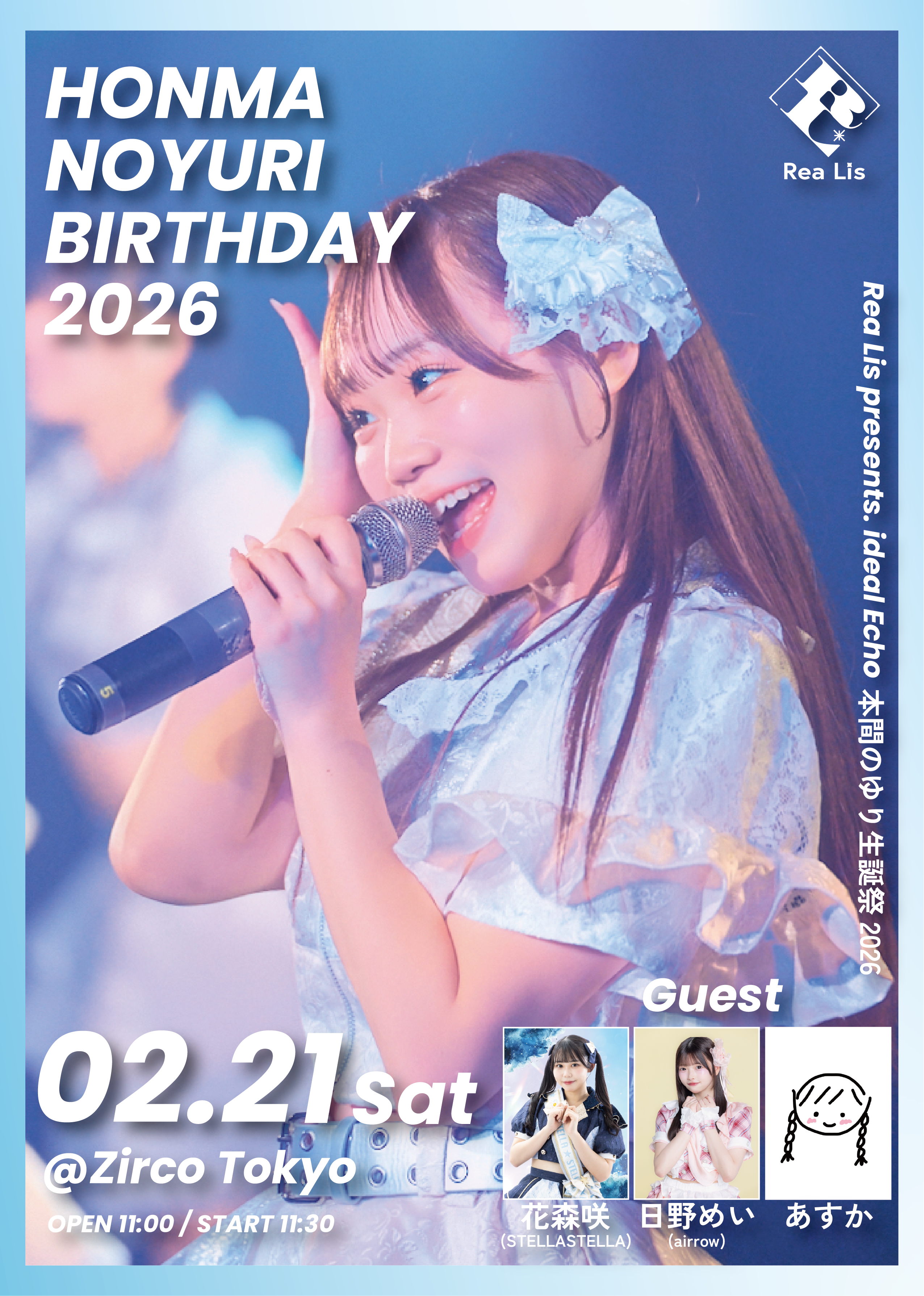 新宿歌舞伎町 Zirco Tokyo (ジルコトーキョー) スケジュール 2026.2.21(Sat) Rea Lis presents.『ideal Echo ~本間のゆり生誕祭~』 [ACT] Rea Lis / 花森咲(STELLASTELLA) / あすか / 日野めい(airrow) [OPEN/START] 11:00/11:30 [料金] 生誕限定SS ¥6,000(Tシャツ付・前売のみ) 前方S ¥4,000 / 一般A ¥2,000 / 当日:前方S ¥5,000 / 一般A ¥3,000(各+1D) (問)Zirco Tokyo 03-6278-9190 / info@zirco-tokyo.jp