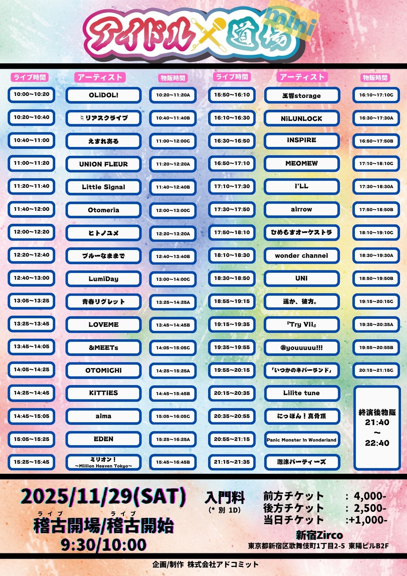 - 前方チケット¥4,000- /一般チケット¥2,500-/当日券各+¥1,000 (1Drink代金¥700別途必要)