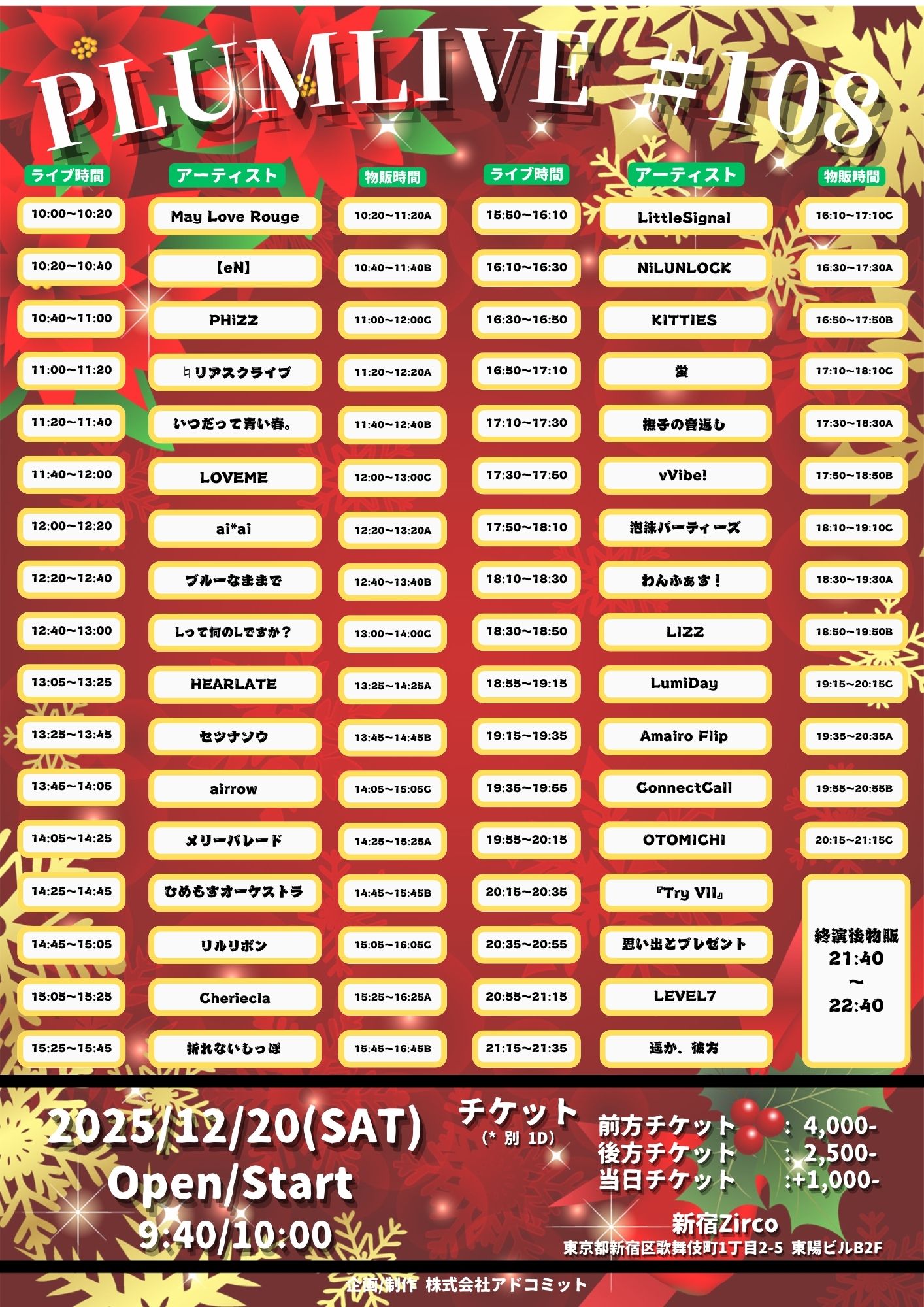 - 前方チケット¥4,000-/ 一般チケット¥2,500-/当日チケット各+¥1,000 (1Drink代金¥700別途必要)