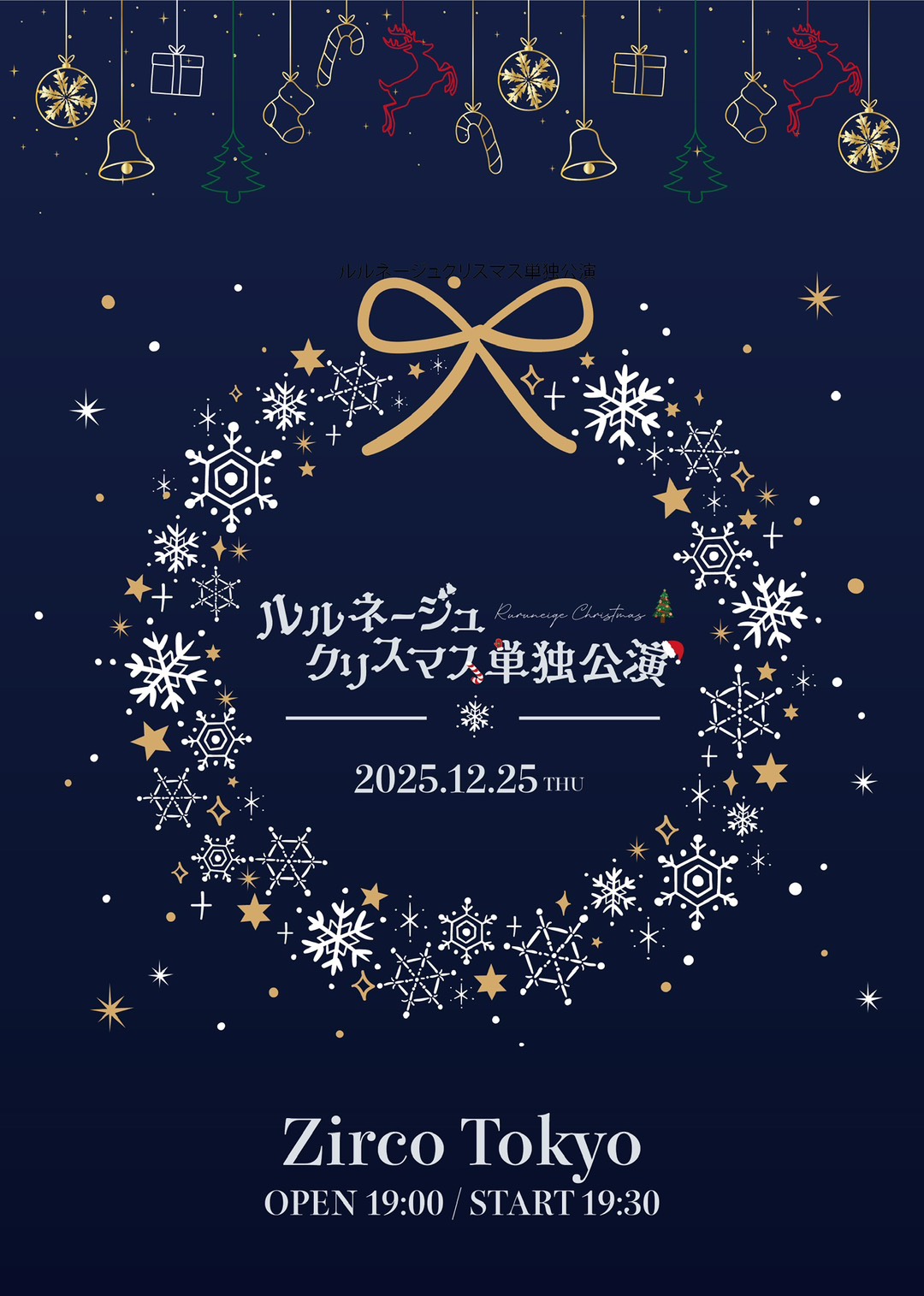 新宿歌舞伎町 Zirco Tokyo (ジルコトーキョー) スケジュール 2025.12.25(Thu) ルルネージュクリスマス単独公演 [ACT] ルルネージュ [OPEN/START] 19:00/19:30 [料金] 前方エリア ¥6,000(クリスマスプレゼント付き) / 一般エリア ¥1,500(1Drink代金¥700別途必要) https://tiget.net/events/446959