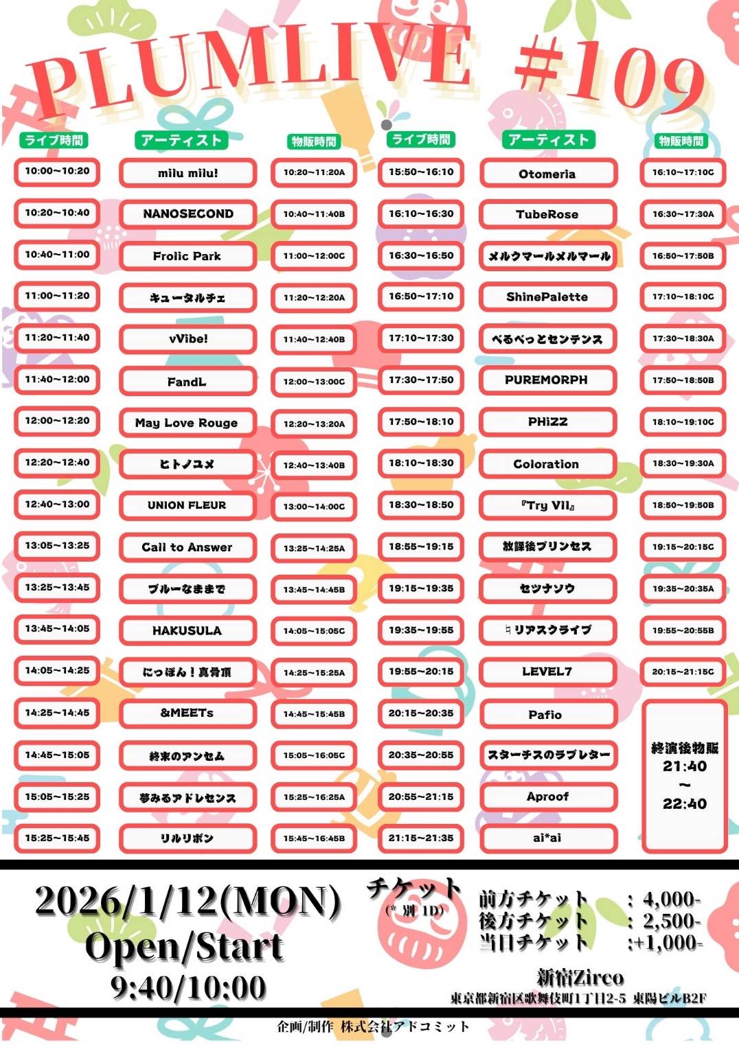 - 前方チケット¥4,000/一般チケット¥2,500-(1Drink代金¥700別途必要)