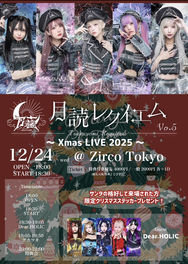 新宿歌舞伎町 Zirco Tokyo (ジルコトーキョー) スケジュール 2025.12.24(Wed) 月読レクイエム Vol.5 〜Xmas LIVE 2025〜 [ACT] アカツキ/Dear.HOLIC [OPEN/START] 18:00/18:30 [料金] 優先/¥4,000 一般¥2,000- (1Drink代金¥700別途必要) https://livepocket.jp/e/tsukuyomi_vol