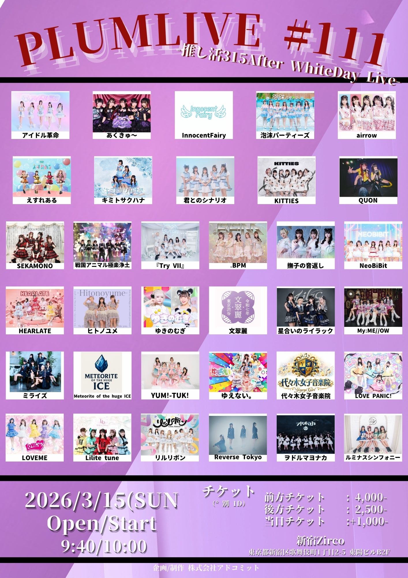 - 前方チケット¥4,000/一般チケット¥2,500/当日チケット(各+1,000円) (1Drink代金¥700別途必要)