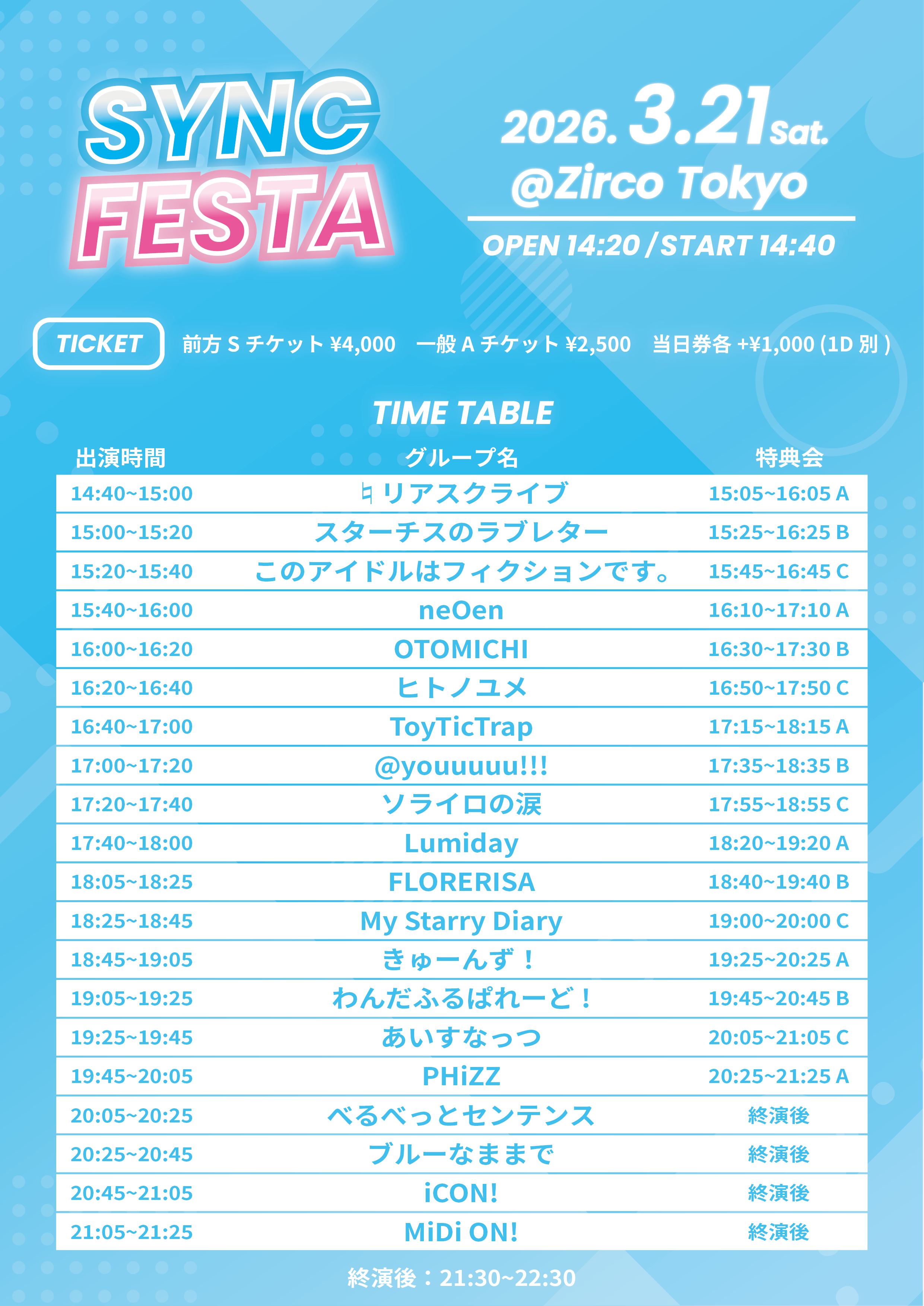 - 前方チケット¥4,000/一般チケット¥2,500/当日券各+¥1,000 (1Drink代金¥700別途必要)