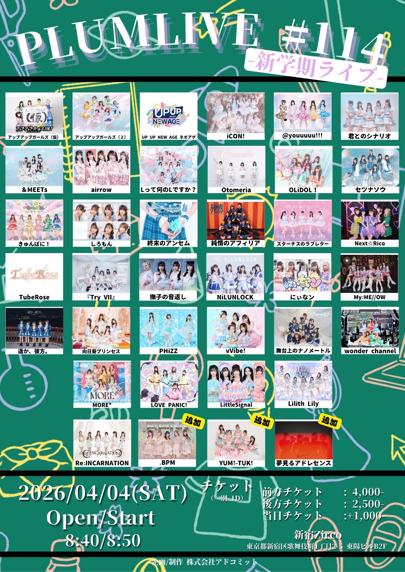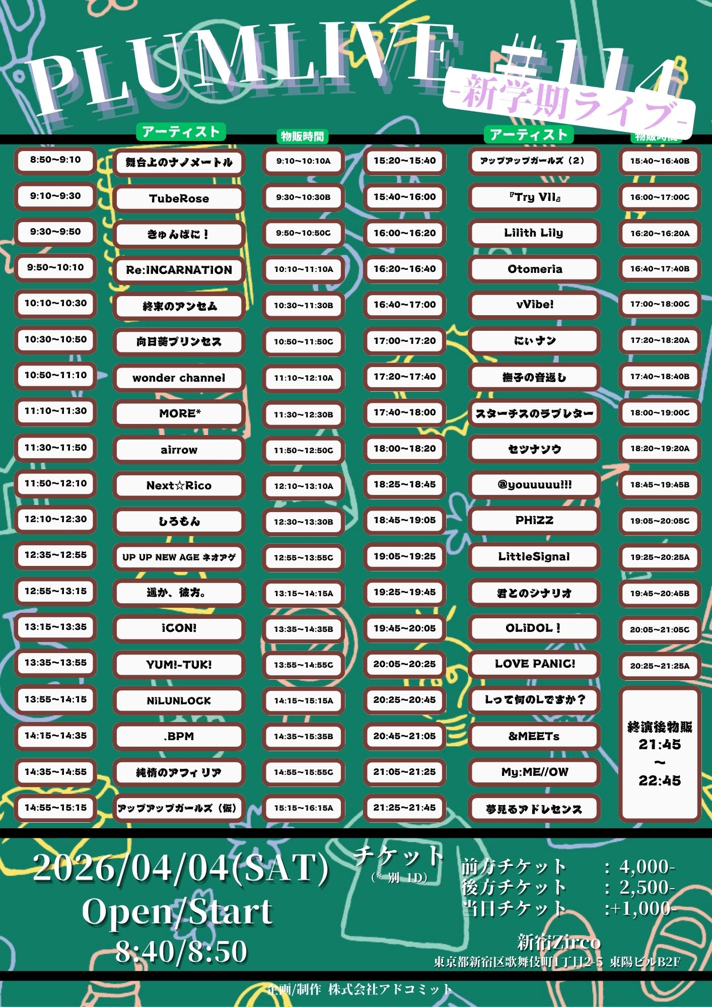 - 前方チケット¥4,000/一般チケット¥2,500/当日チケット(各+1,000円) (1Drink代金¥700別途必要)