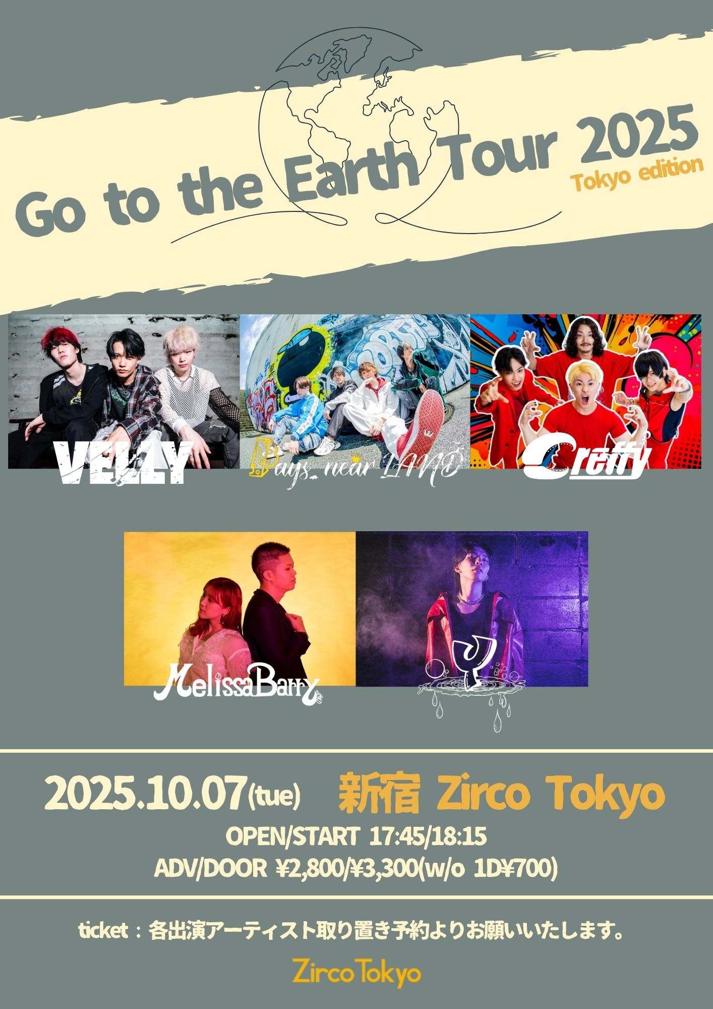 新宿歌舞伎町 Zirco Tokyo (ジルコトーキョー) スケジュール 2025.10.07(Tue) Go to the Earth Tour 2025-Tokyo edition- [ACT] VEŁŁY / Melissa Barry / Days,near LAND /大石裕太郎/Creffy [OPEN/START] 17:45/18:15 [料金] ADV/DOOR ¥2800/¥3300 (1Drink代金¥700別途必要) (問)Zirco Tokyo 03-6278-9190 / info@zirco-tokyo.jp