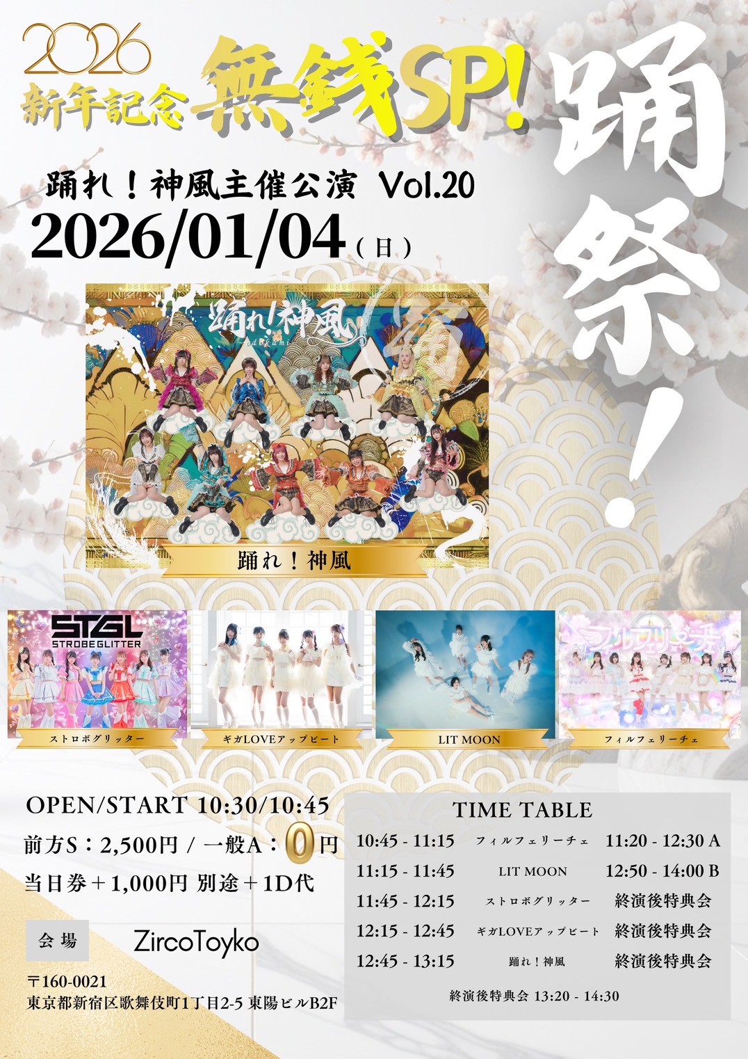 新宿歌舞伎町 Zirco Tokyo (ジルコトーキョー) スケジュール 2026.1.04(Sun) 『踊祭!vol.20 新年記念無銭SP!』 [ACT] 踊れ!神風/ストロボグリッター/フィルフェリーチェ/LIT MOON/ギガLOVEアップビート [OPEN/START] 10:30/10:45 [料金] 前方Sチケット¥2,500円 /一般Aチケット¥0円 /当日+1000円(+1D) (問)Zirco Tokyo 03-6278-9190 / info@zirco-tokyo.jp