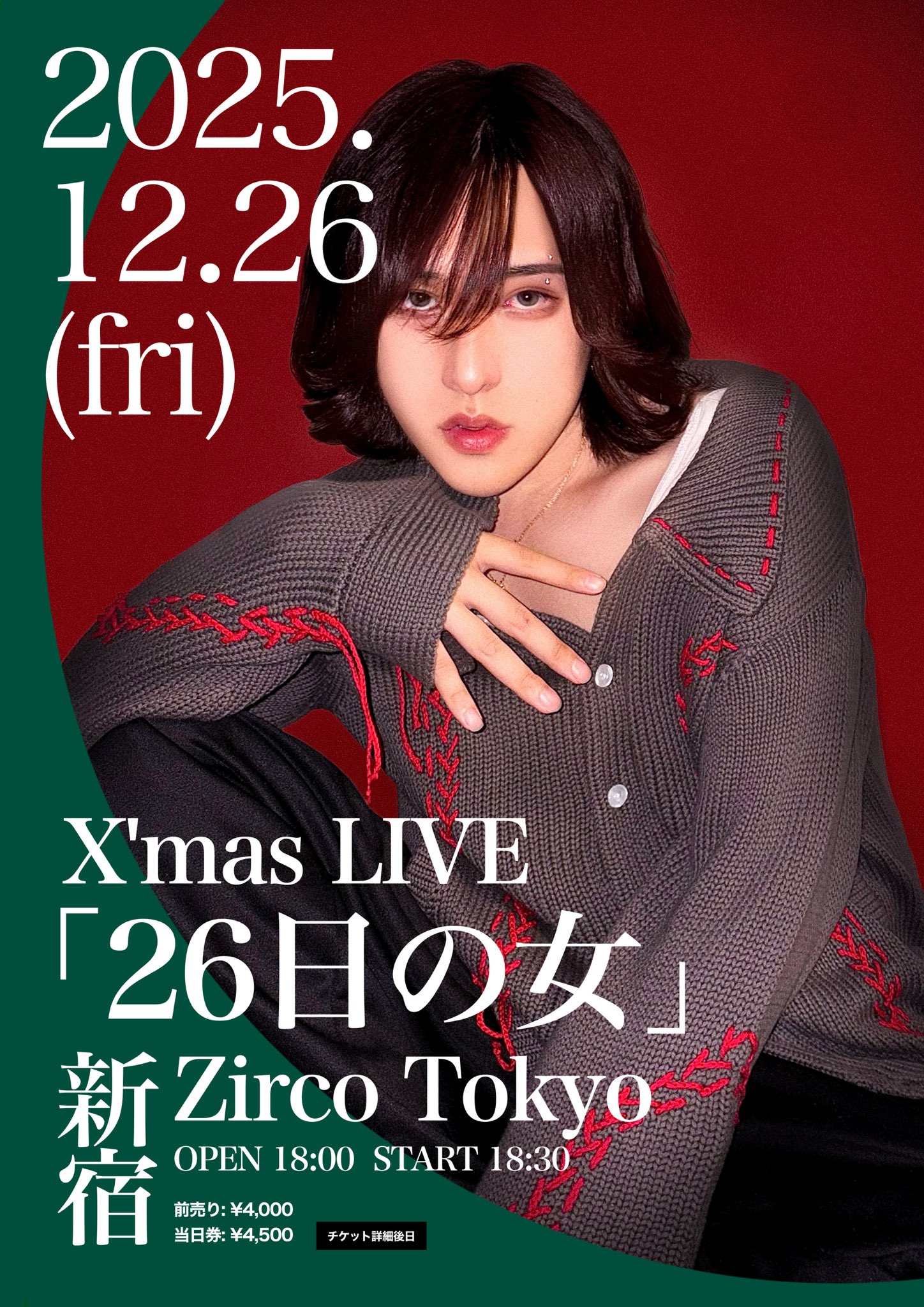 新宿歌舞伎町 Zirco Tokyo (ジルコトーキョー) スケジュール 2025.12.26(Fri) 香月 紅茶Xmas Live 「26日の女」 [ACT] 香月紅茶 [OPEN/START] 18:00/18:30 [料金] ADV/DOOR ¥4,000/¥4,500- (1Drink代金¥700別途必要) (問)Zirco Tokyo 03-6278-9190 / info@zirco-tokyo.jp