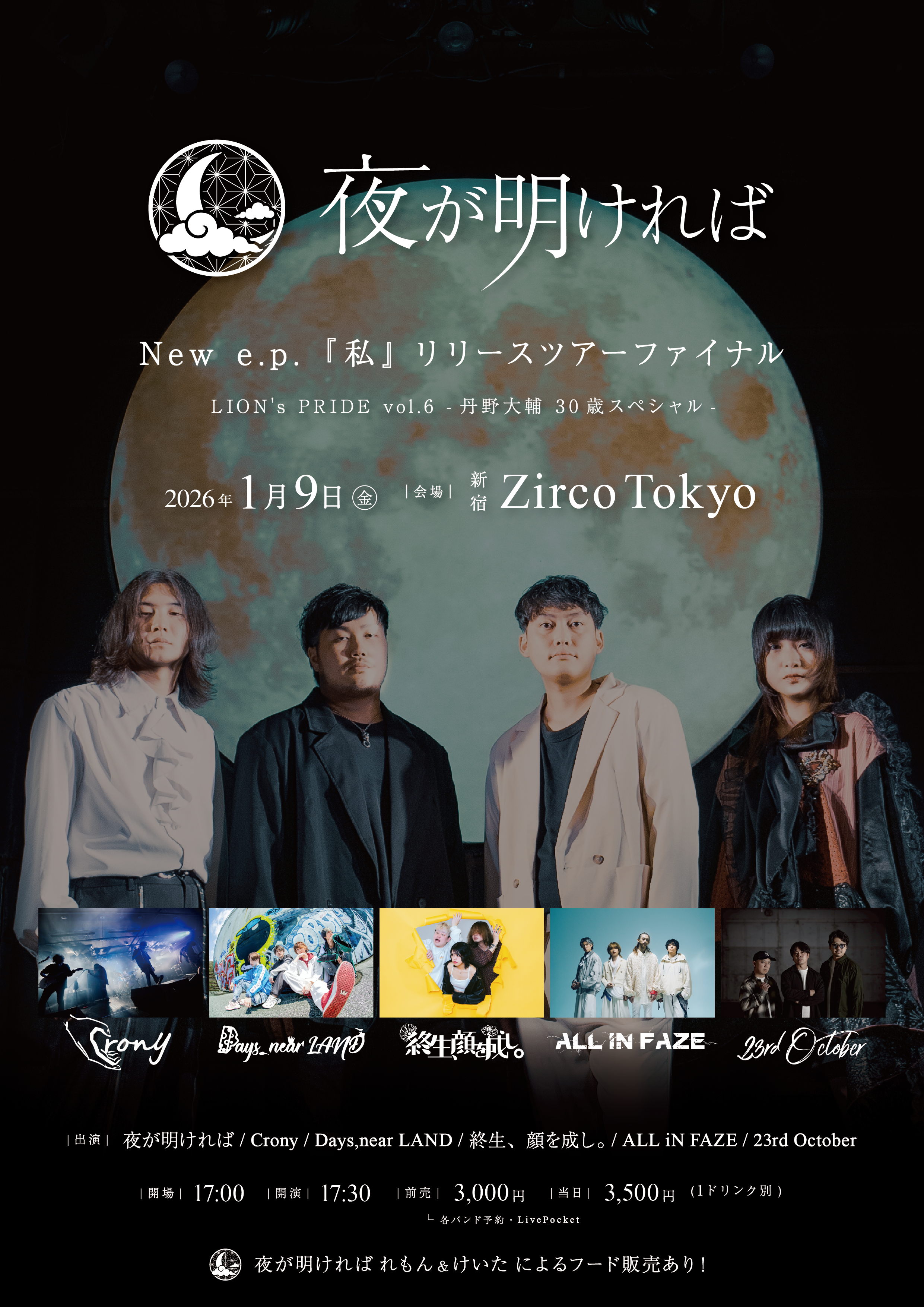 - 夜が明ければ / Crony / 終生、顔を成し。 / Days,near LAND / ALL iN FAZE / 23rd October(仙台)【フード】 れもん&けいた