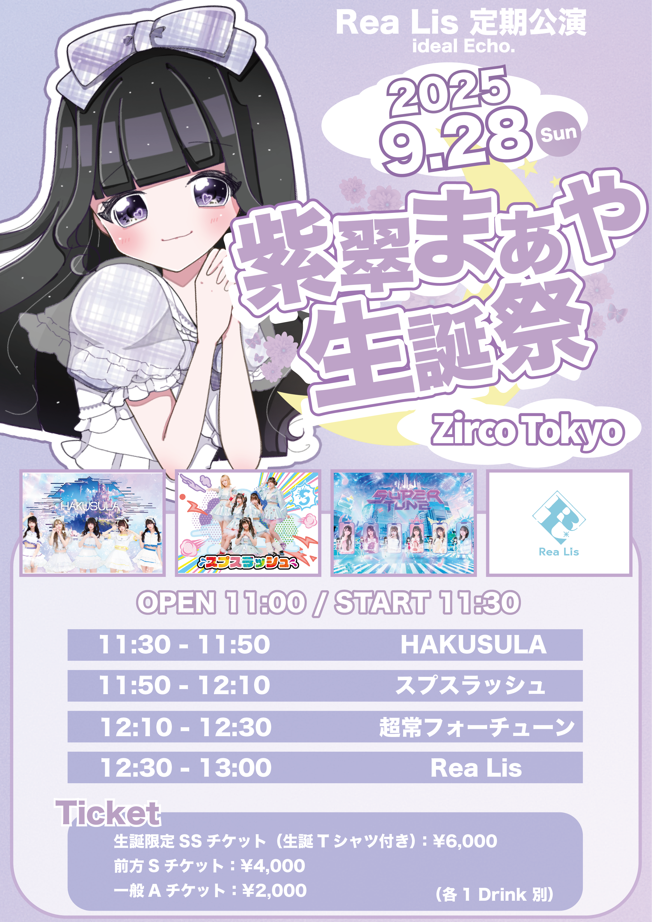 新宿歌舞伎町 Zirco Tokyo (ジルコトーキョー) スケジュール 2025.9.28(Sun) Rea Lis 定期公演『ideal Echo.〜紫翠まあや生誕祭〜』 [ACT] Rea Lis/HAKUSULA/超常フォーチューン/スプスラッシュ [OPEN/START] 11:00/11:30 [料金] 生誕限定SSチケット:¥6,000/(前売り)前方Sチケット:¥4,000/一般Aチケット:¥2,000(1Drink代金¥700別途必要) (問)Zirco Tokyo 03-6278-9190 / info@zirco-tokyo.jp