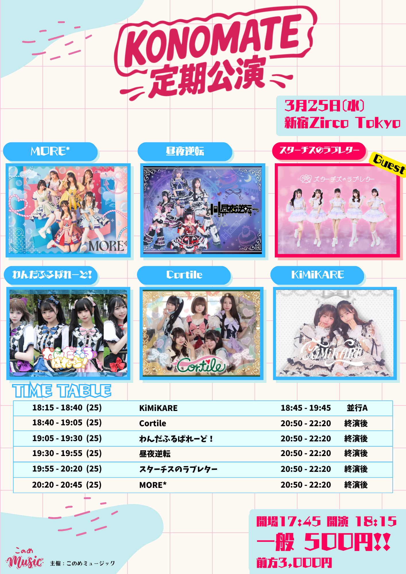 新宿歌舞伎町 Zirco Tokyo (ジルコトーキョー) スケジュール 2026.3.25(Wed) 「KONOMATE定期公演 vol.3」@新宿ZircoTokyo [ACT] MORE* / わんだふるぱれーど! / Cortile / KiMiKARE / 昼夜逆転 / スターチスのラブレター [OPEN/START] 17:45/18:15 [料金] 前方3,000円 /一般500円 /※当日+500円 (1Drink代金¥700別途必要) (問)Zirco Tokyo 03-6278-9190 / info@zirco-tokyo.jp