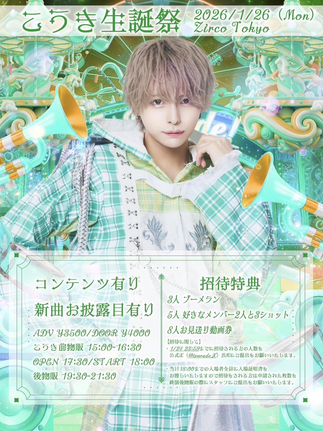 新宿歌舞伎町 Zirco Tokyo (ジルコトーキョー) スケジュール 2026.1.26(Mon) こうき生誕祭 [ACT] I⭐︎Parade [OPEN/START] 17:30/18:00 [料金] ADV/DOOR ¥3,500/¥4,000- (1Drink代金¥700別途必要) https://livepocket.jp/e/39zoe
