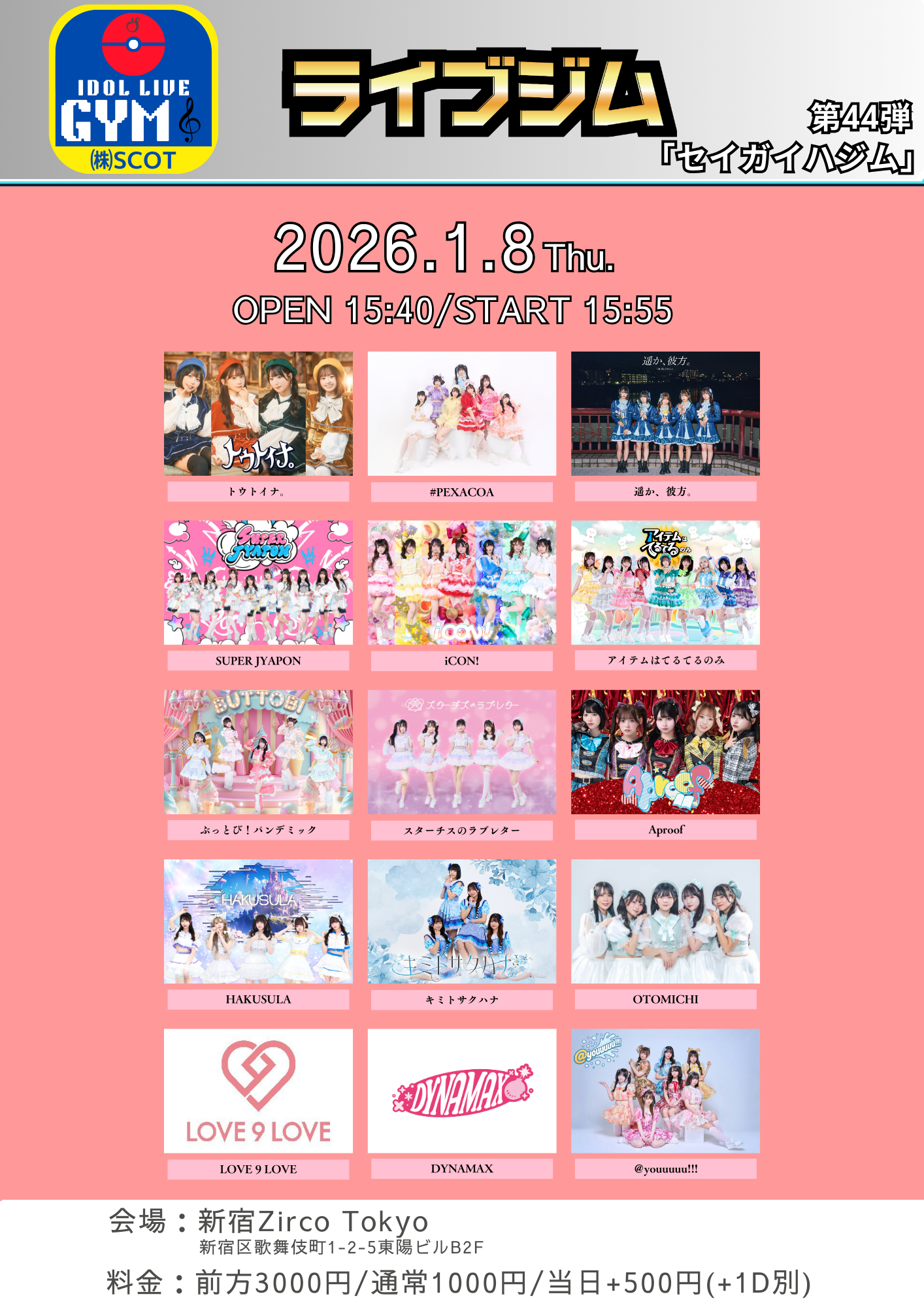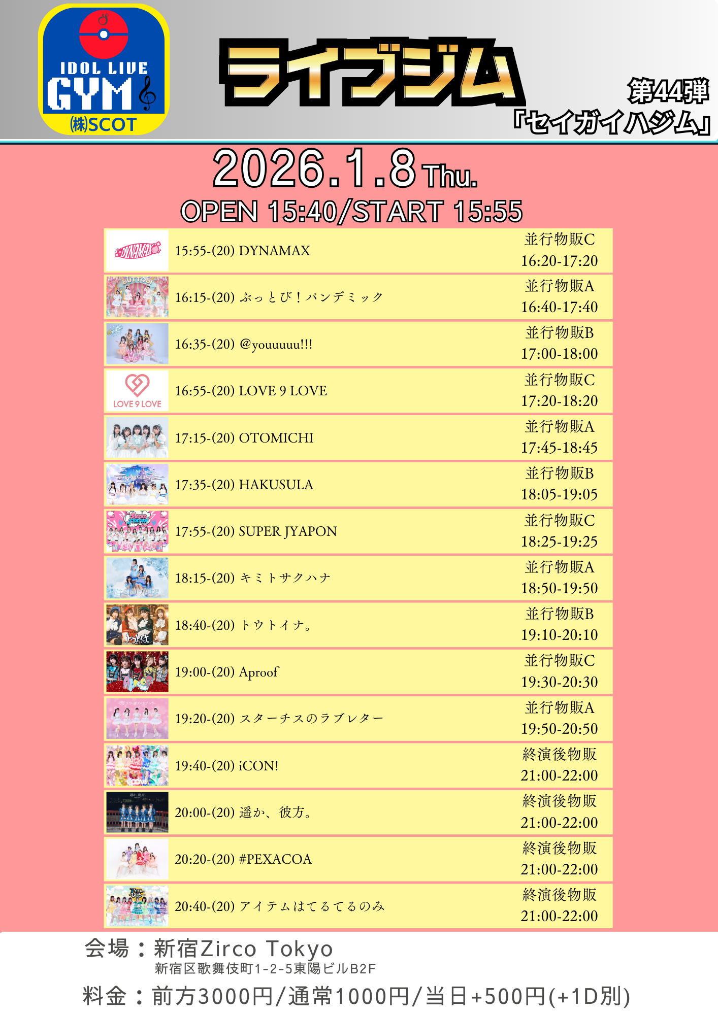 - 前方3000円/通常1000円/当日+500円 (1Drink代金¥700別途必要)