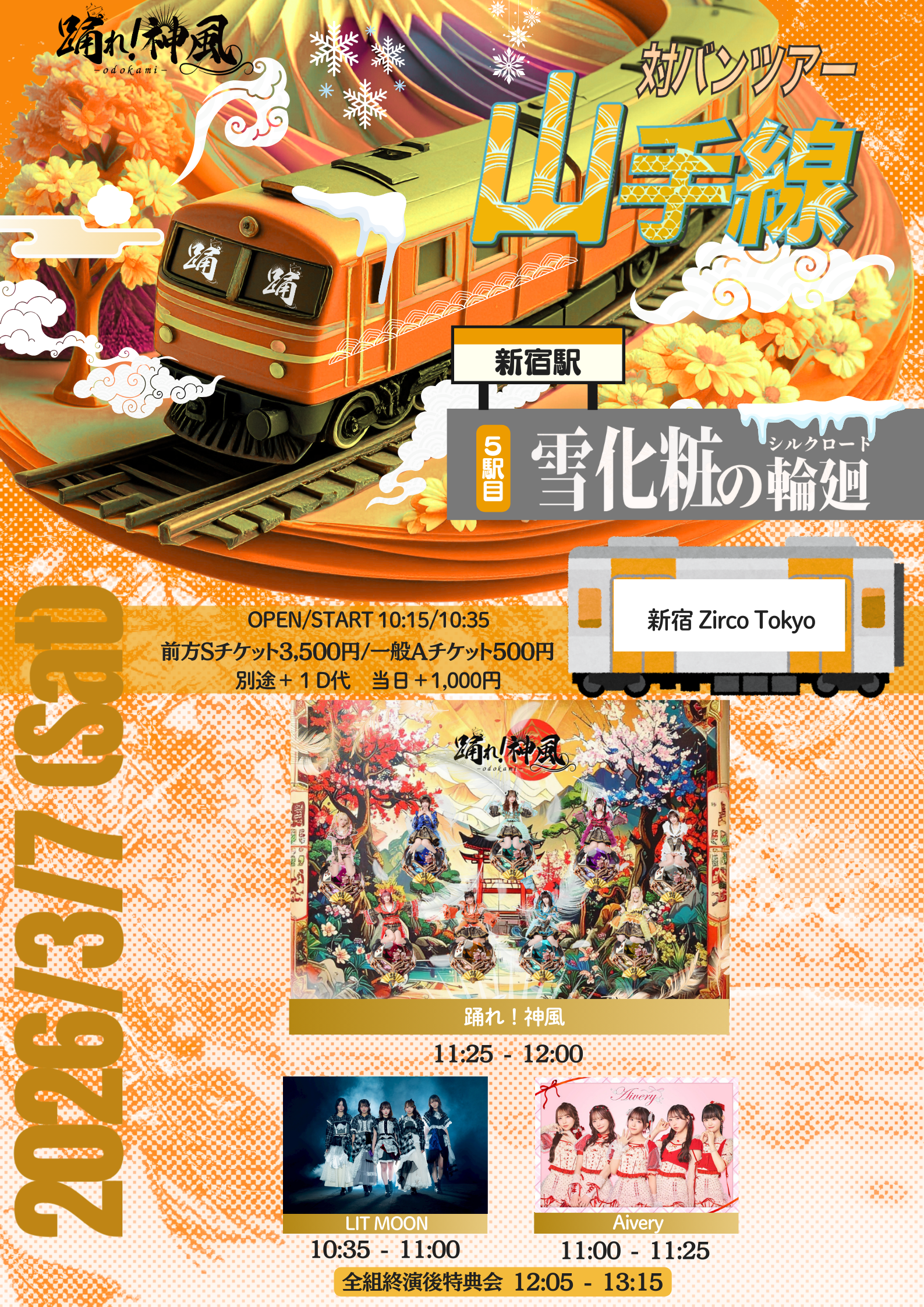 新宿歌舞伎町 Zirco Tokyo (ジルコトーキョー) スケジュール 2026.3.07(Sat) 踊れ!神風山手線ツアー『雪化粧の輪廻-シルクロード-』【新宿駅 [ACT] 踊れ!神風/Aivery/LIT MOON [OPEN/START] 10:15/10:35 [料金] 前方Sチケット:3,500円/一般Aチケット:500円(1Drink代金¥700別途必要) (問)Zirco Tokyo 03-6278-9190 / info@zirco-tokyo.jp